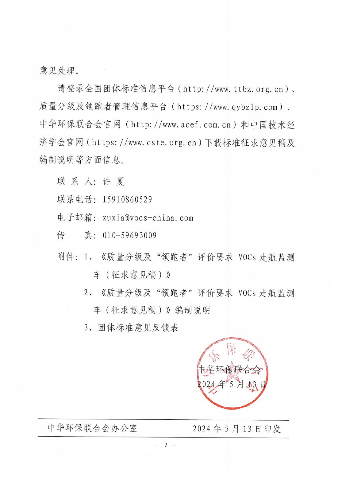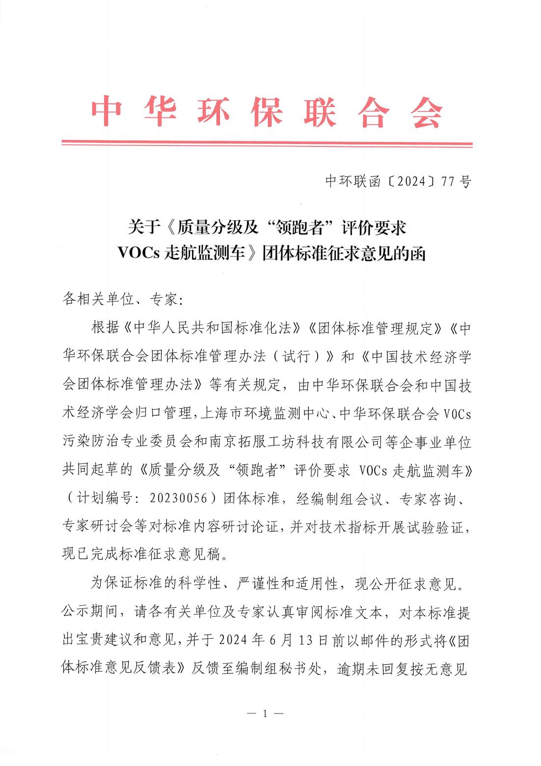 关于《质量分级及“领跑者”评价要求 VOCs走航监测车》团体标准征求意见的函