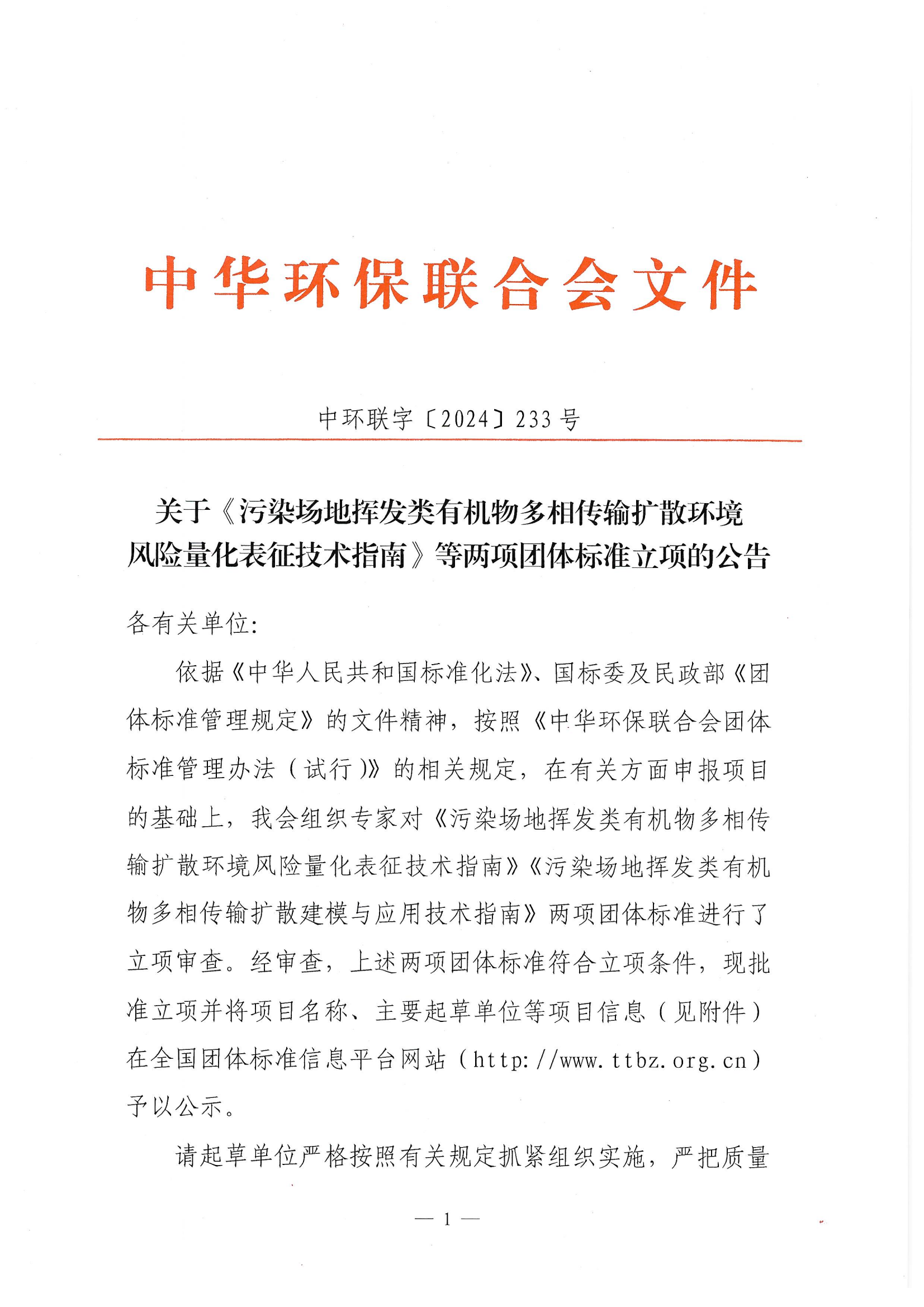 关于《污染场地挥发类有机物多相传输扩散环境风险量化表征技术指南》等两项团体标准立项的公告