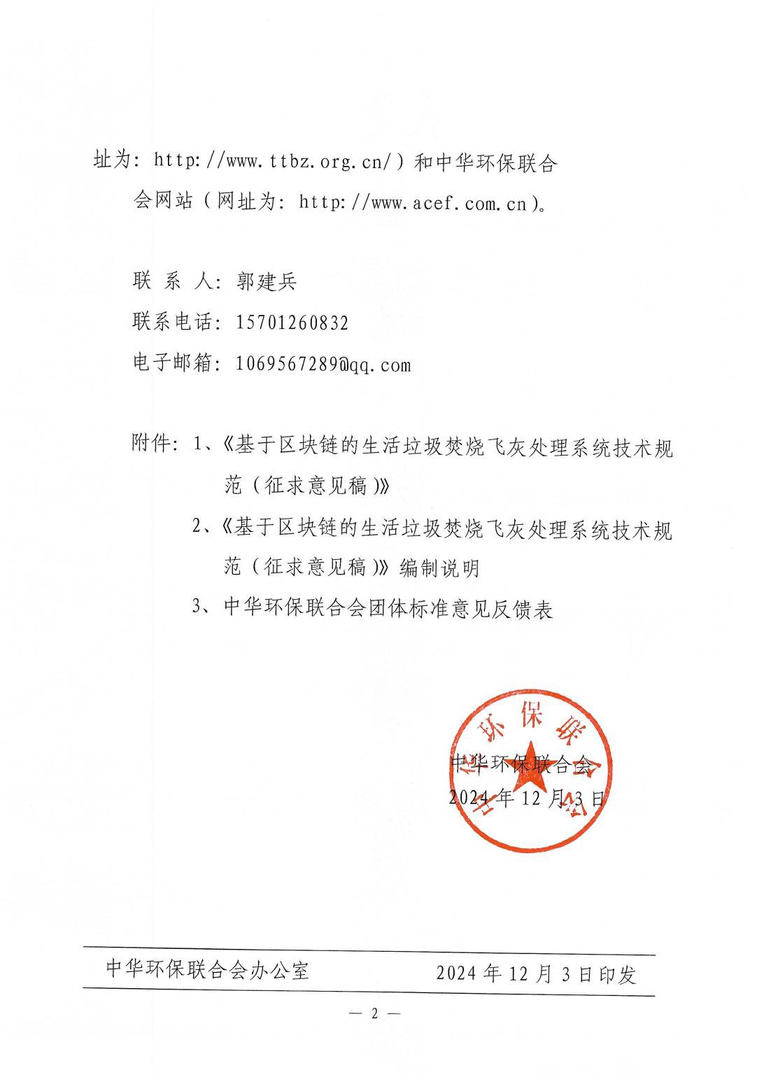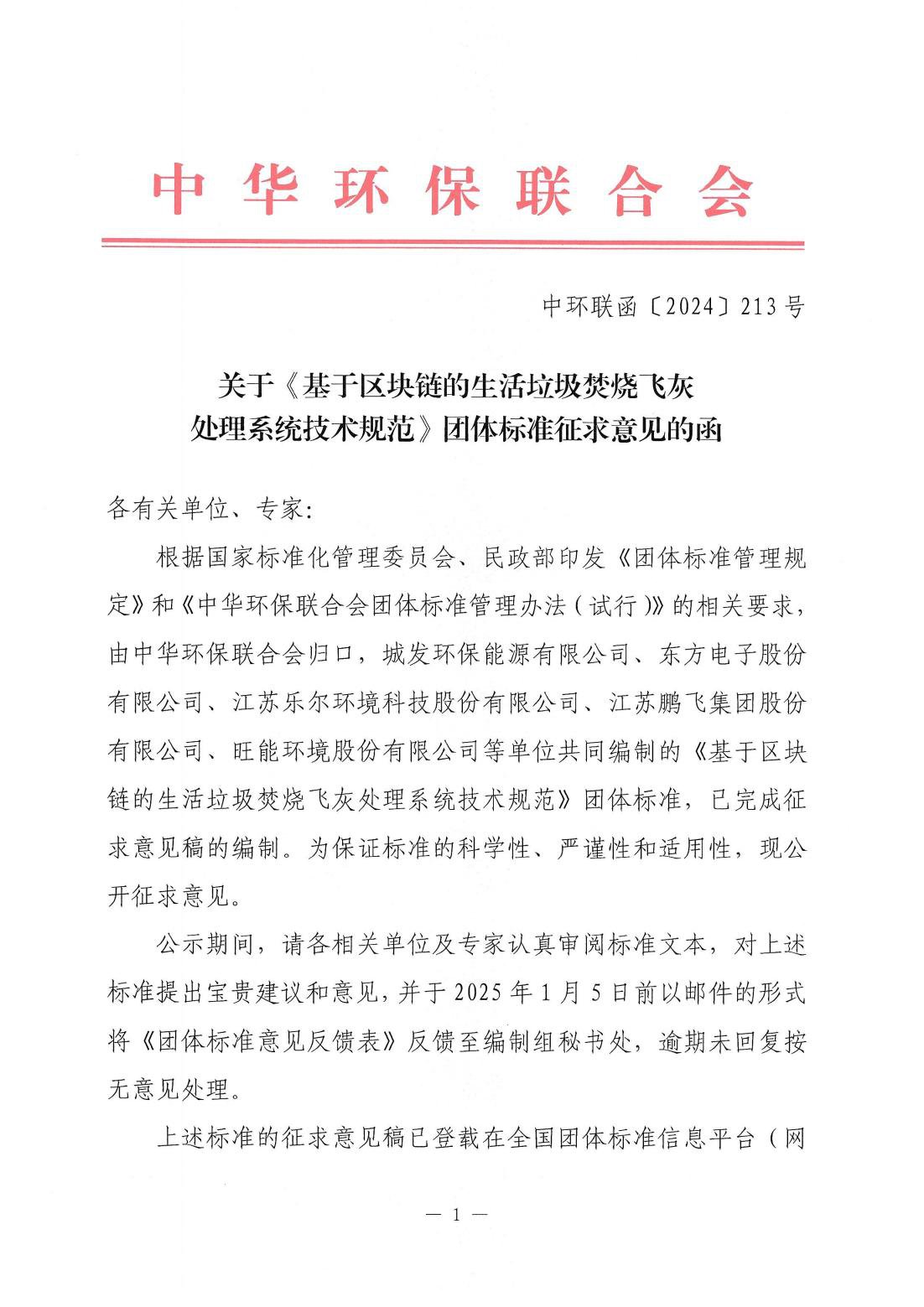 关于《基于区块链的生活垃圾焚烧飞灰处理系统技术规范》团体标准征求意见的函