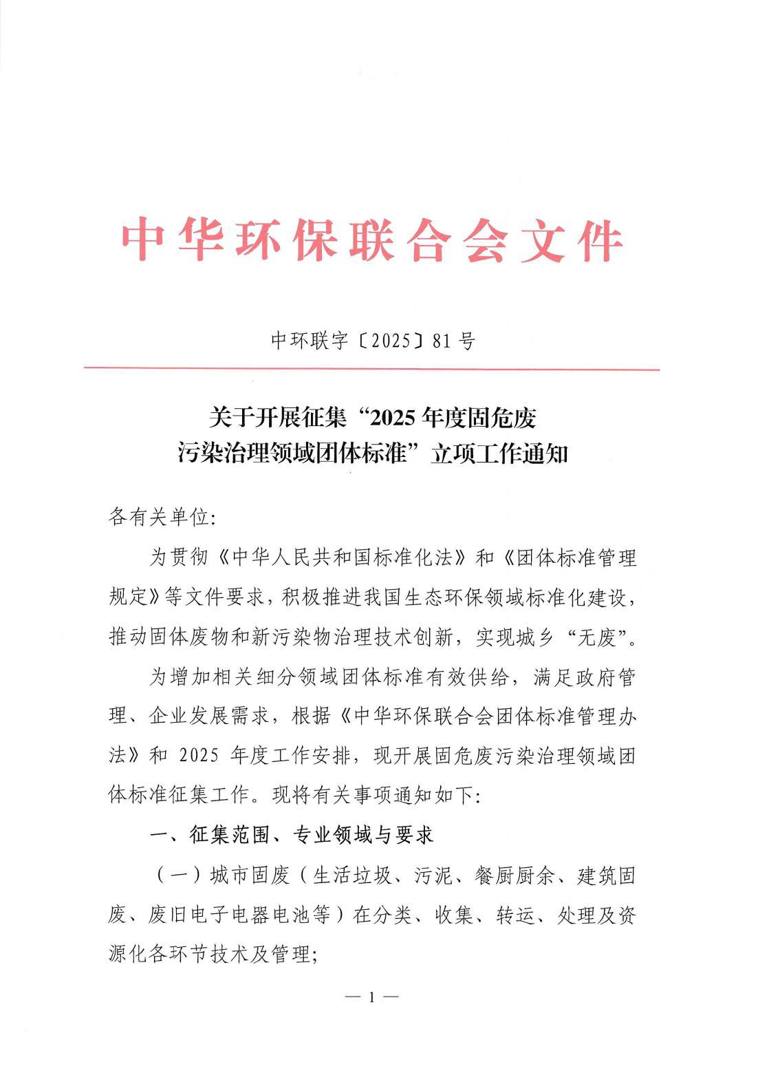 关于开展征集“2025年度固危废污染治理领域团体标准”立项工作通知