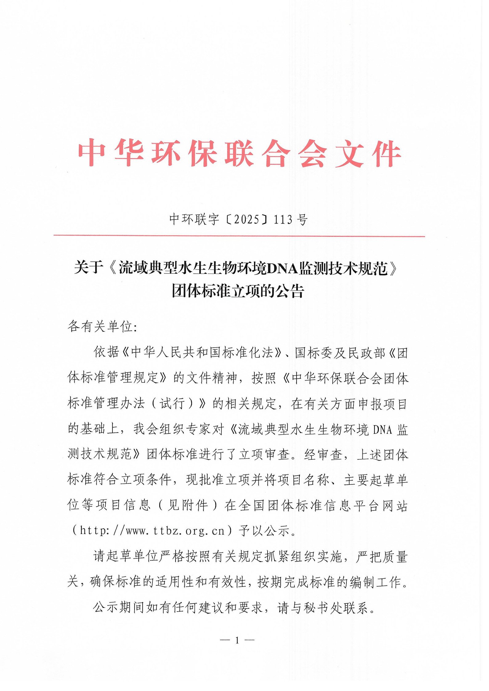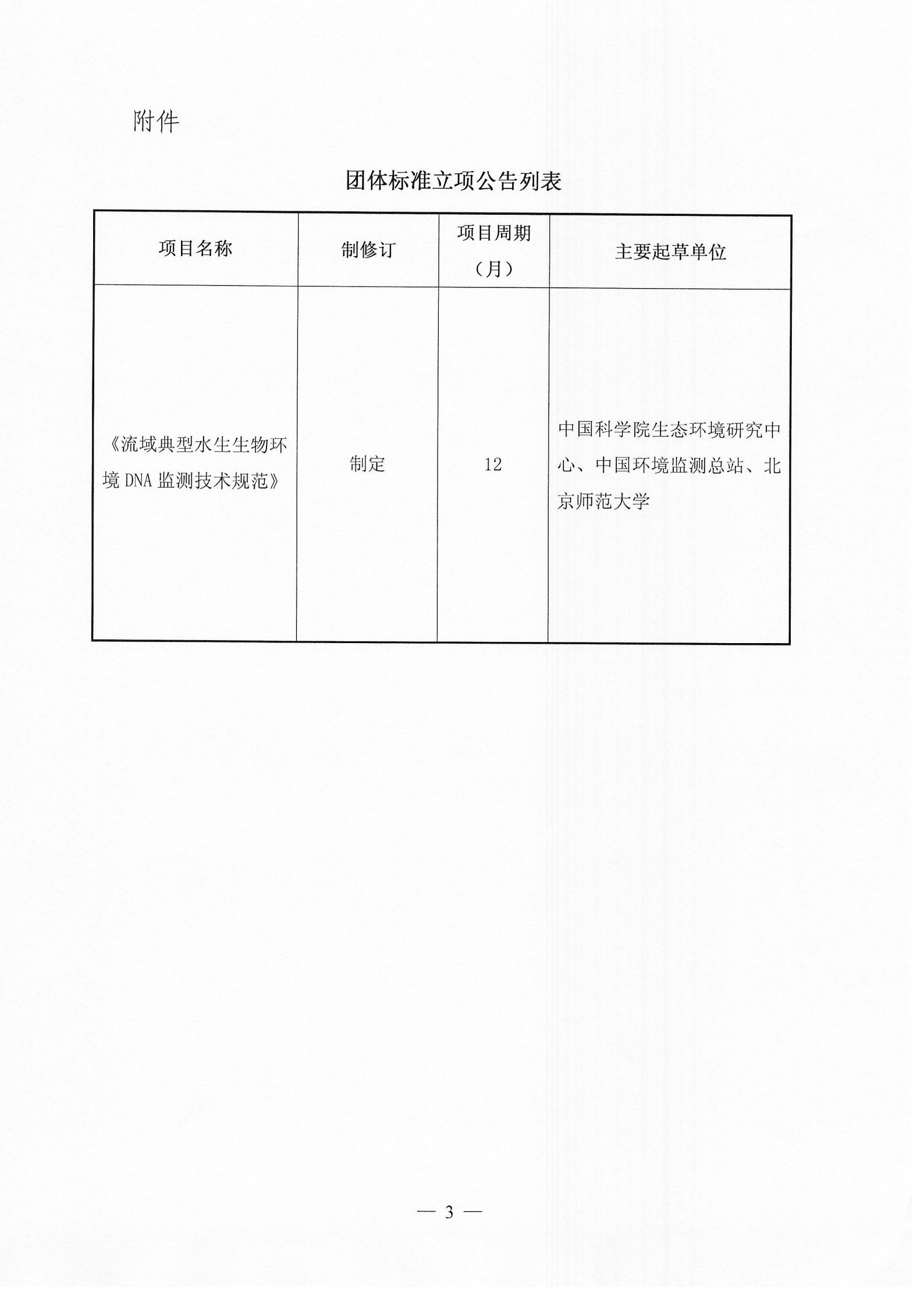 关于《流域典型水生生物环境DNA监测技术规范》团体标准立项的公告