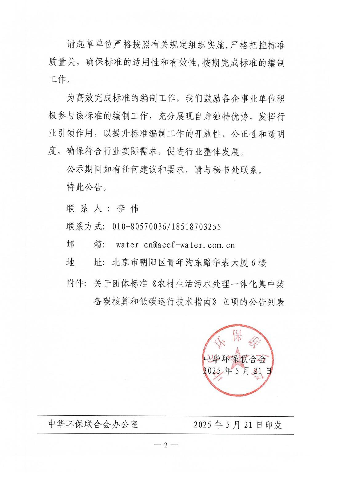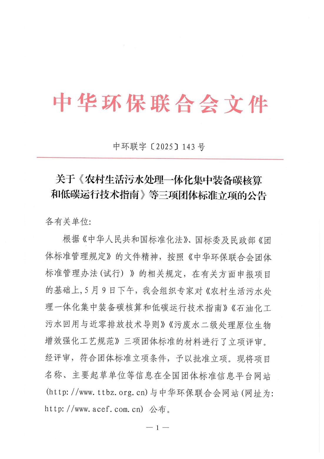 关于 《农村生活污水处理一体化集中装备碳核算和低碳运行技术指南》等三项团体标准立项的公告