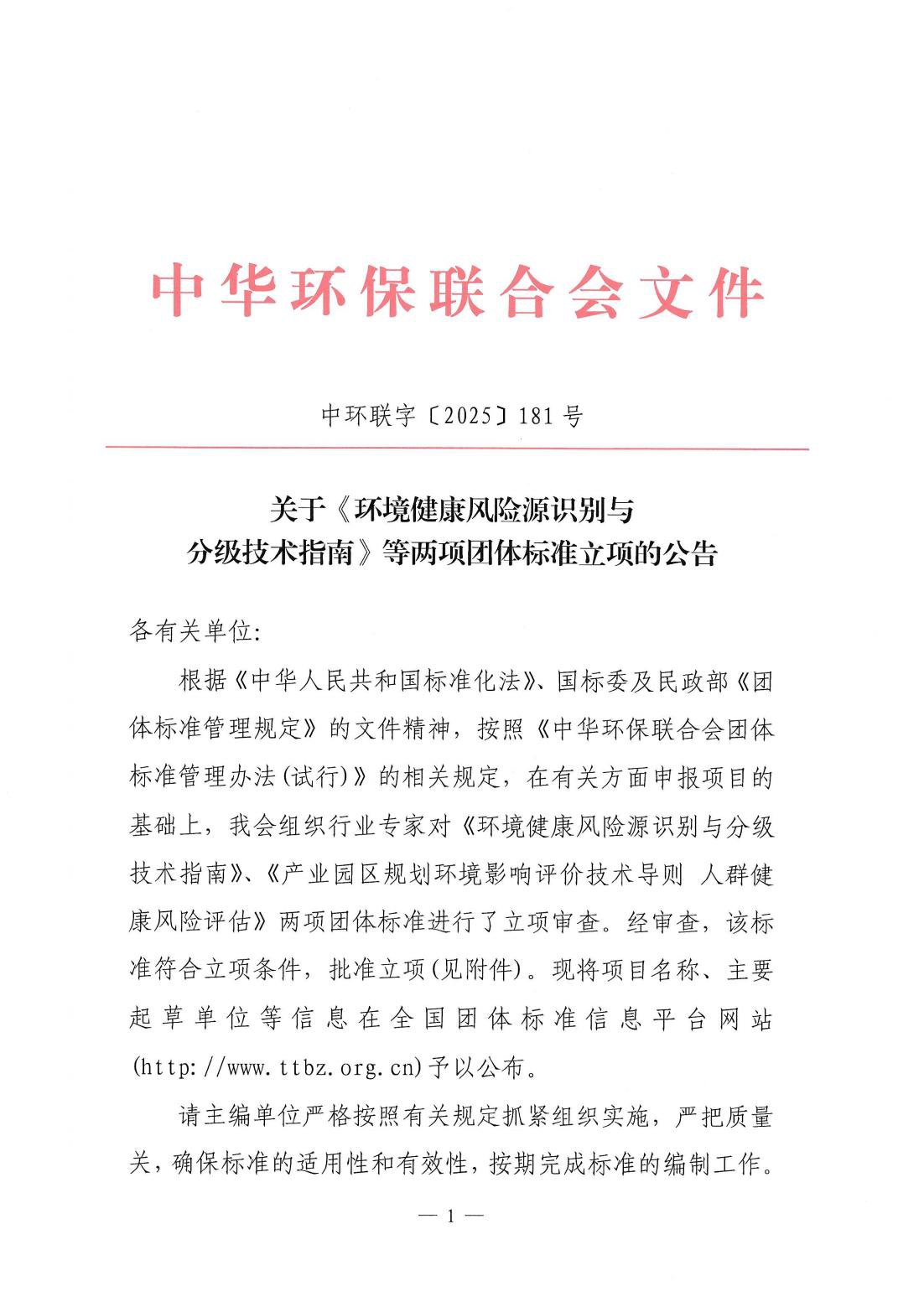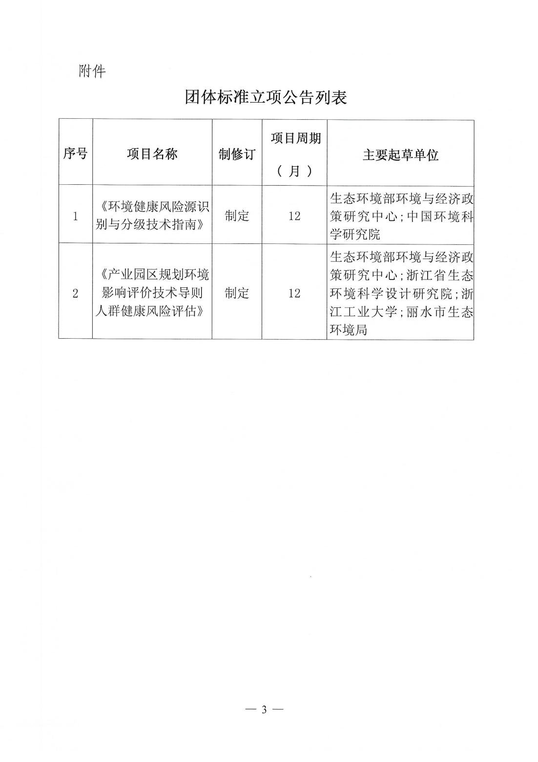 关于《环境健康风险源识别与分级技术指南》等两项团体标准立项的公告