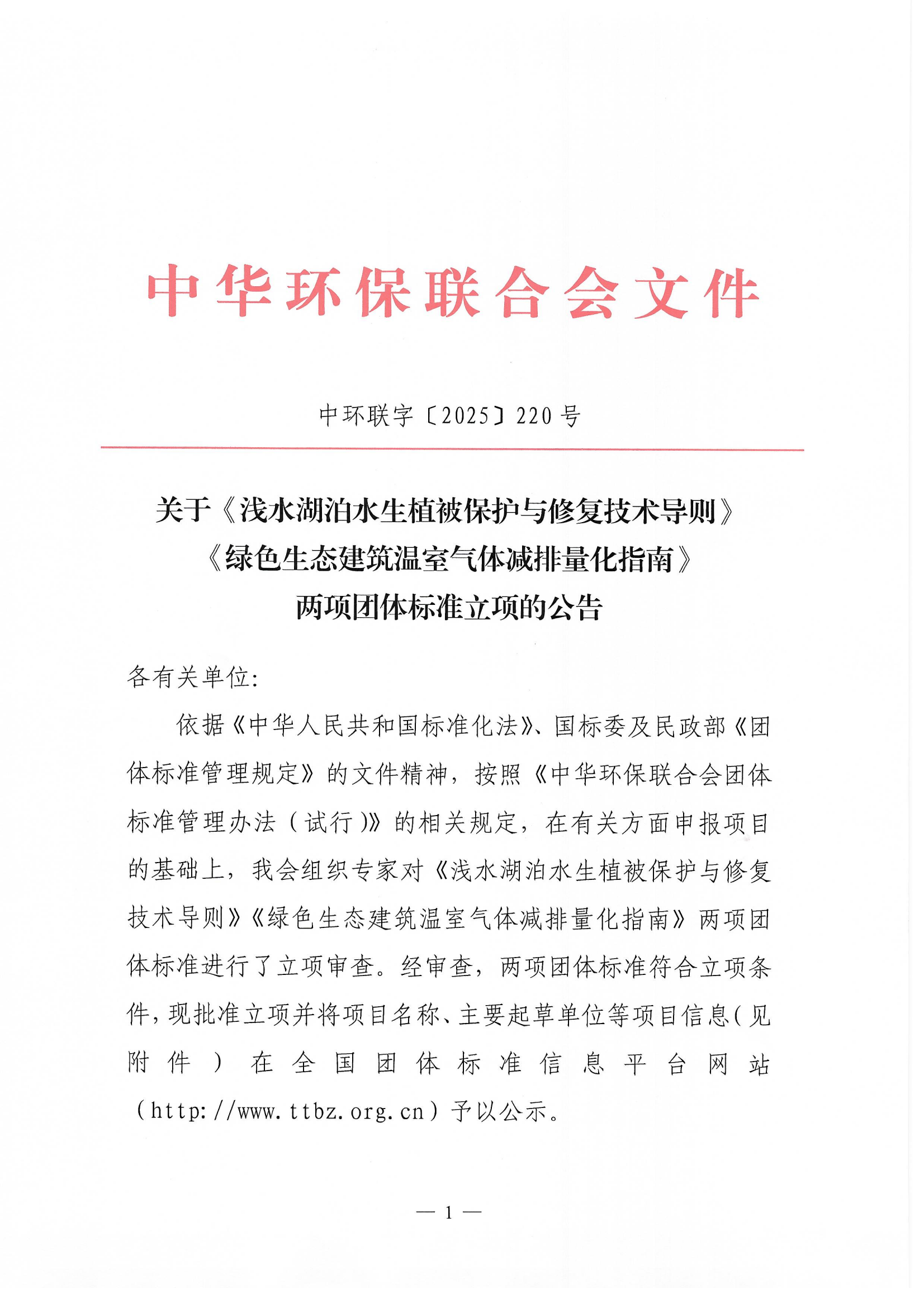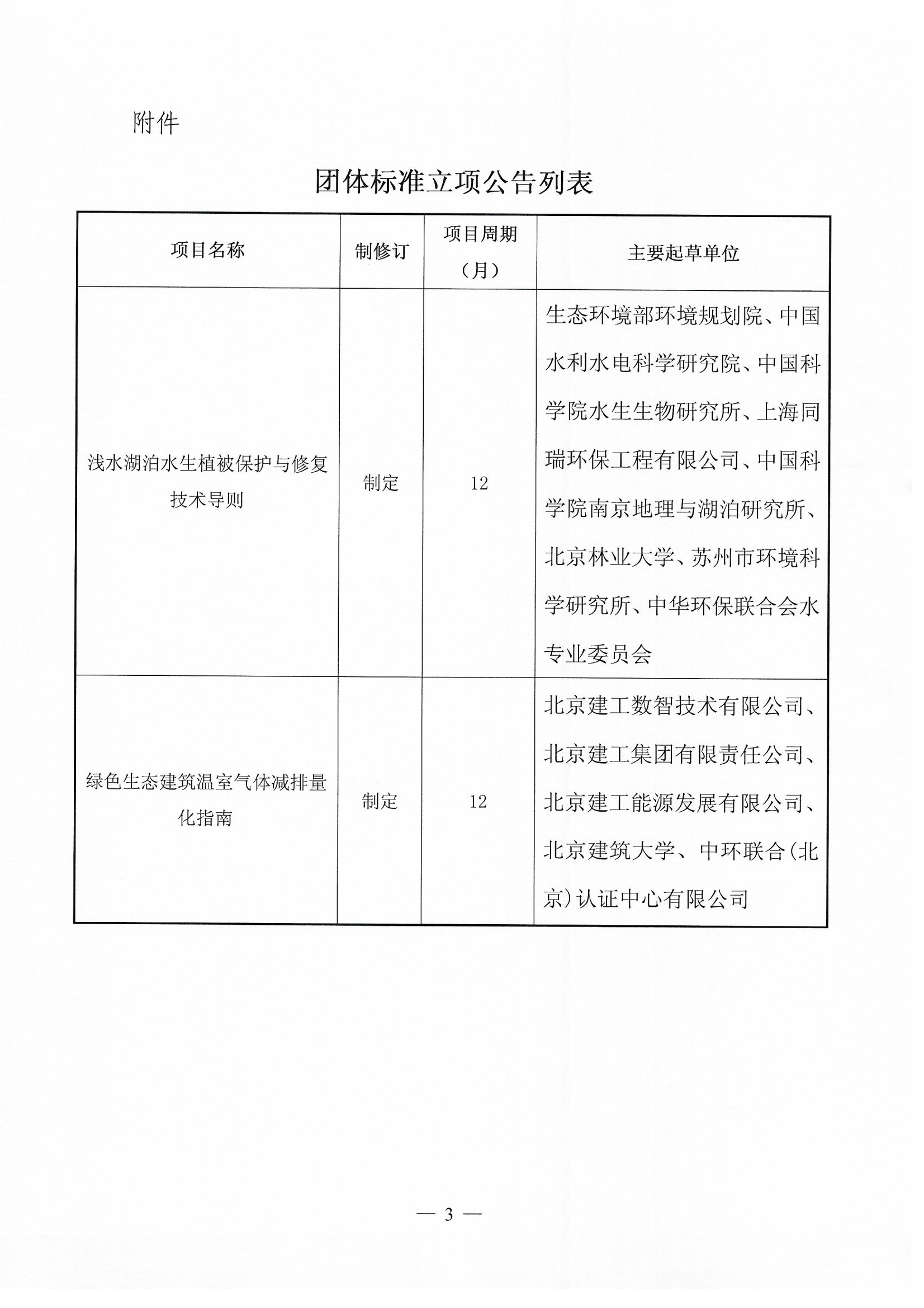 关于《浅水湖泊水生植被保护与修复技术导则》《绿色生态建筑温室气体减排量化指南》两项团体标准立项的公告