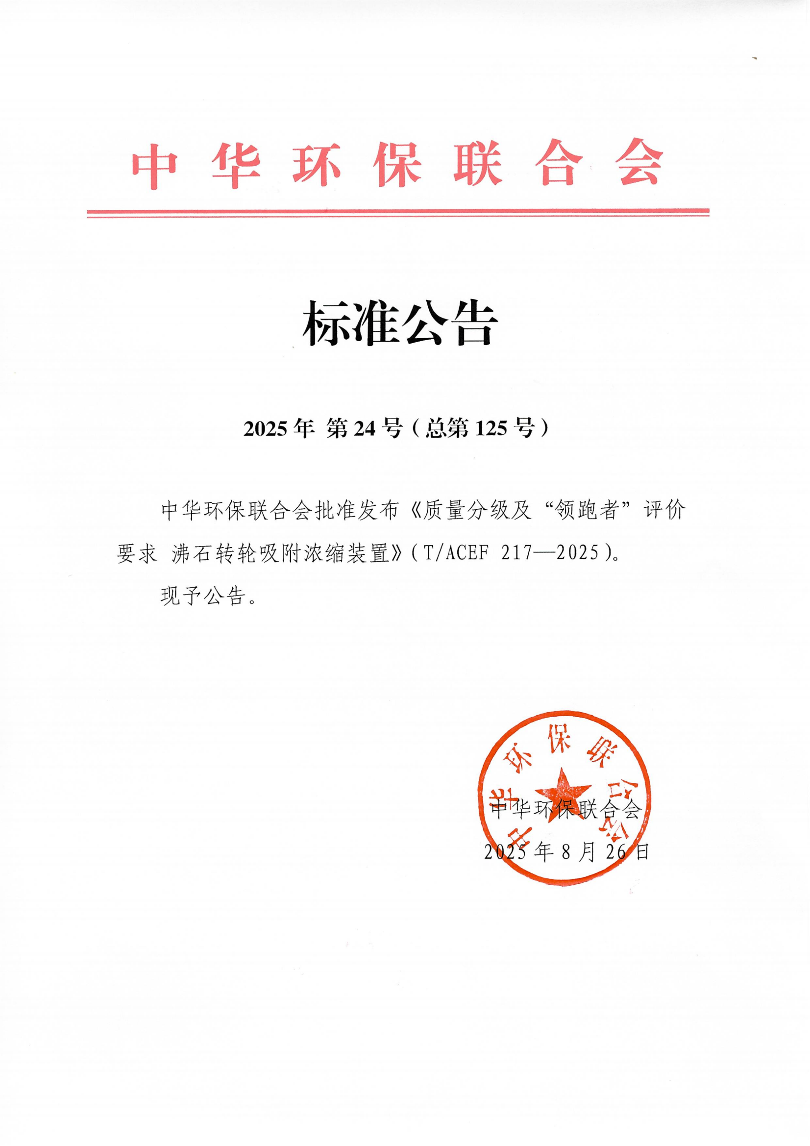 批准发布《质量分级及“领跑者”评价要求 沸石转轮吸附浓缩装置》的公告