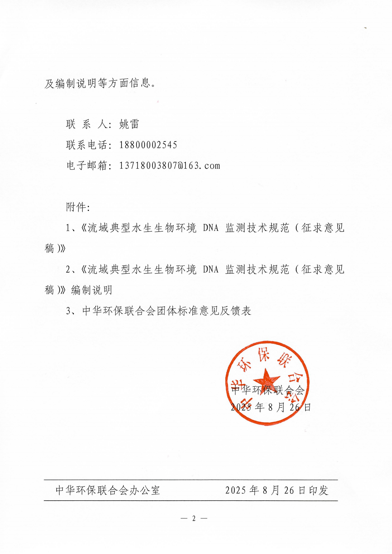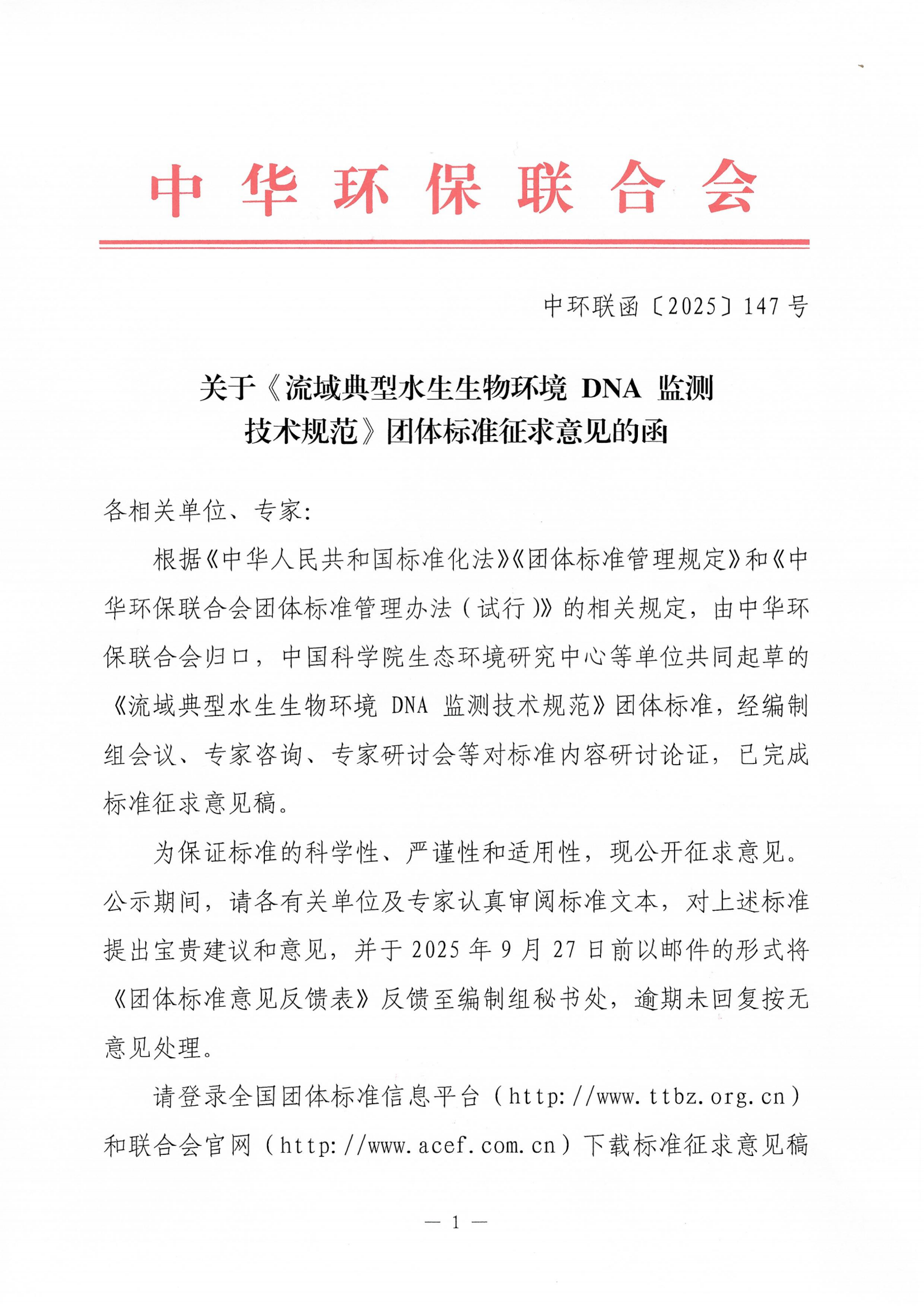 关于《流域典型水生生物环境 DNA 监测技术规范》征求意见的函