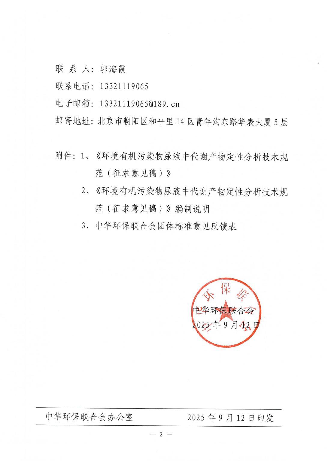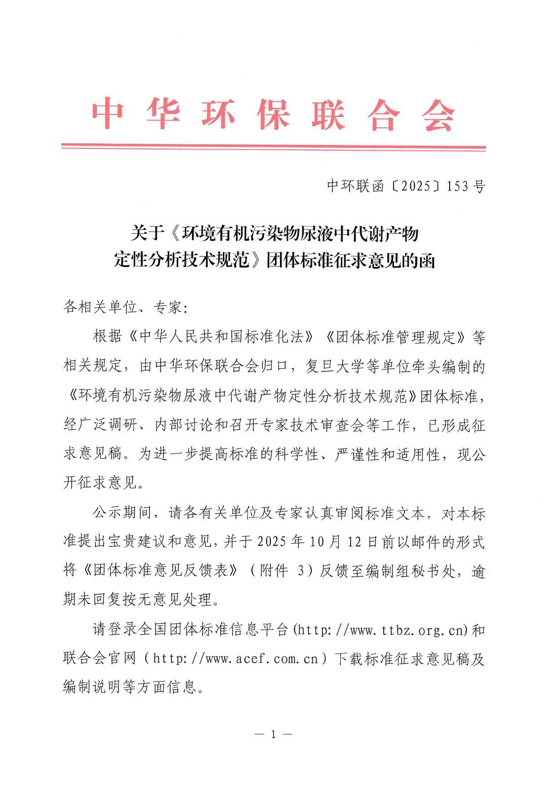 关于《环境有机污染物尿液中代谢产物定性分析技术规范》团体标准征求意见的函