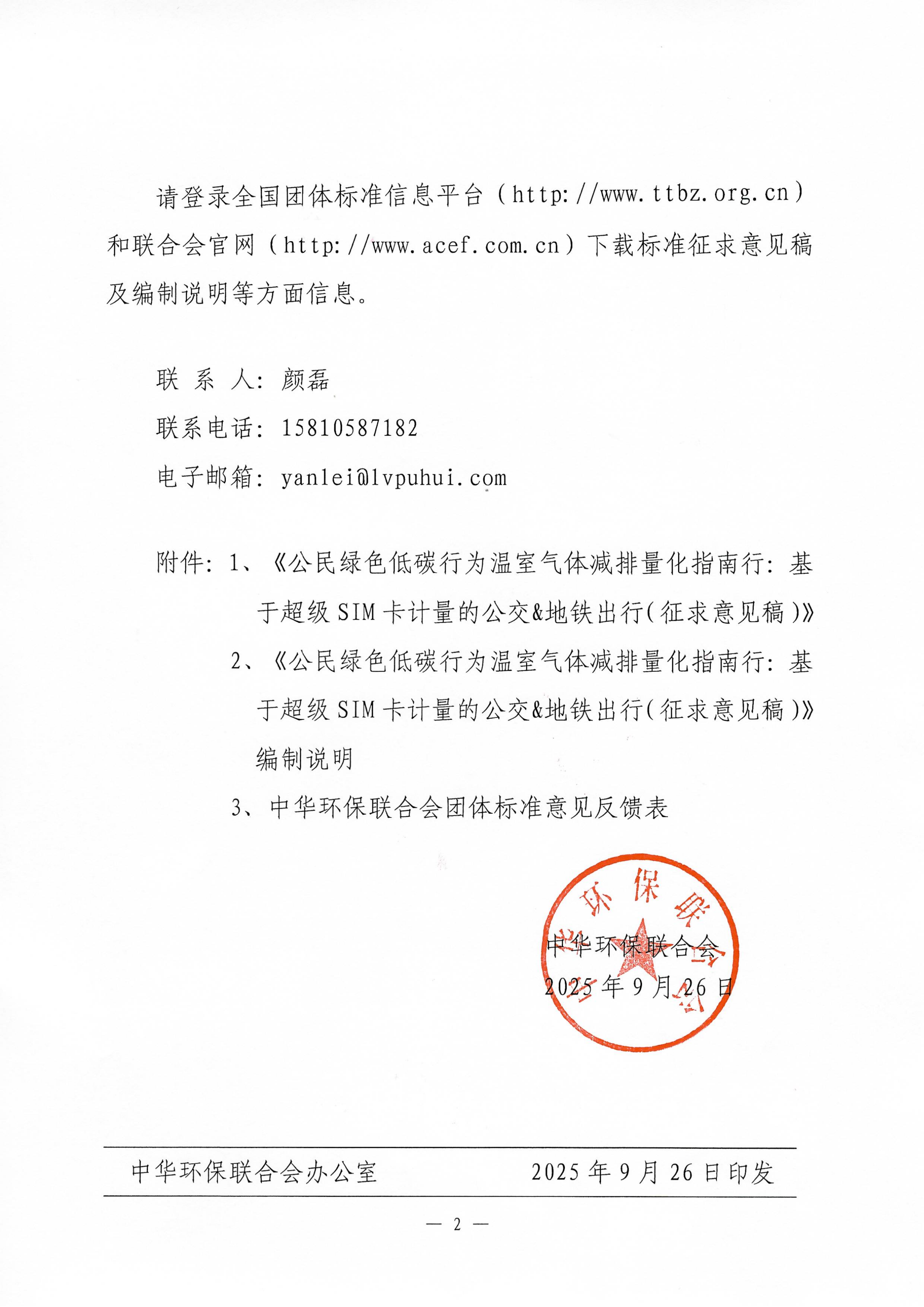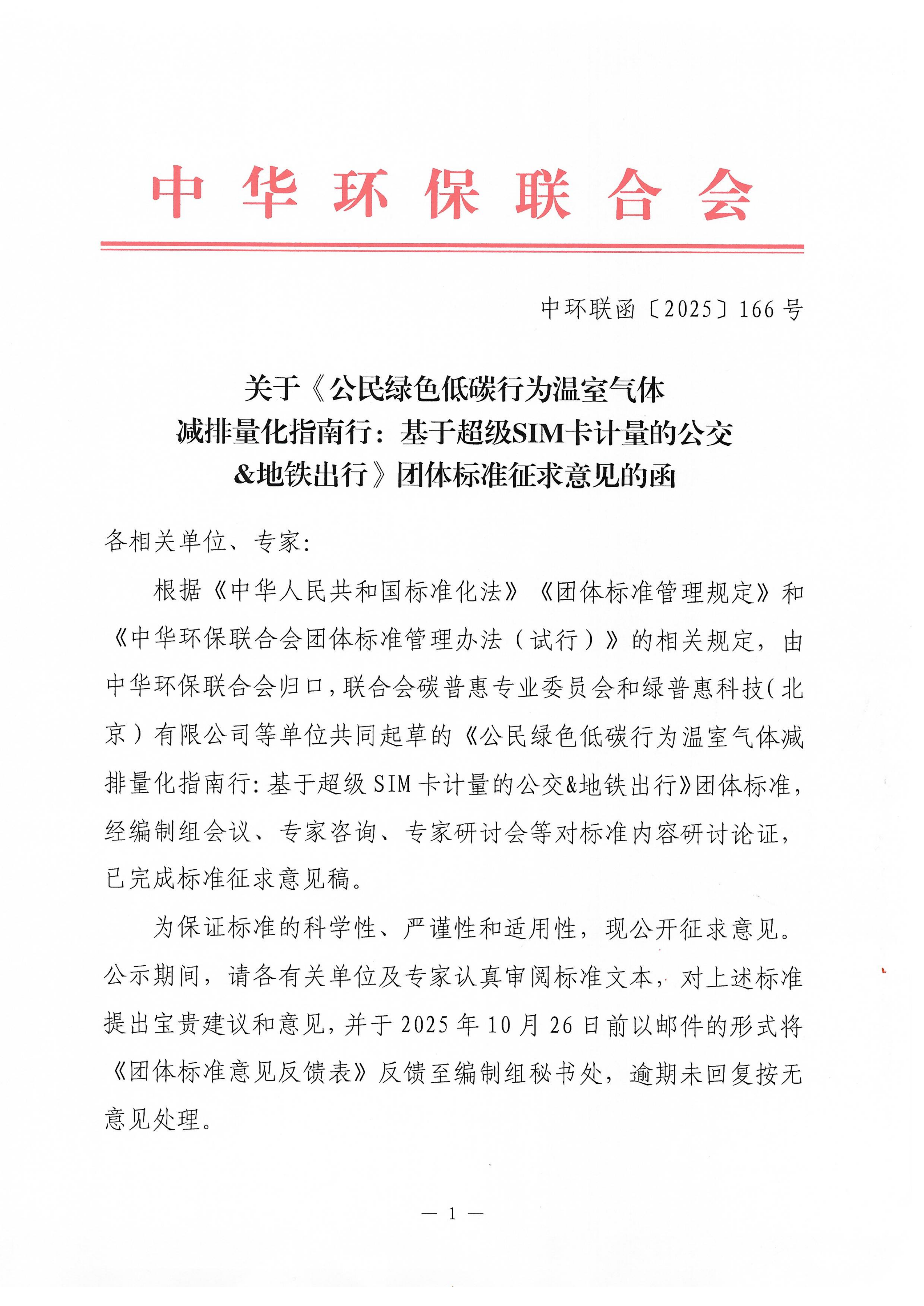 关于《公民绿色低碳行为温室气体减排量化指南行:基于超级SIM卡计量的公交&地铁出行》团体标准征求意见的函 |