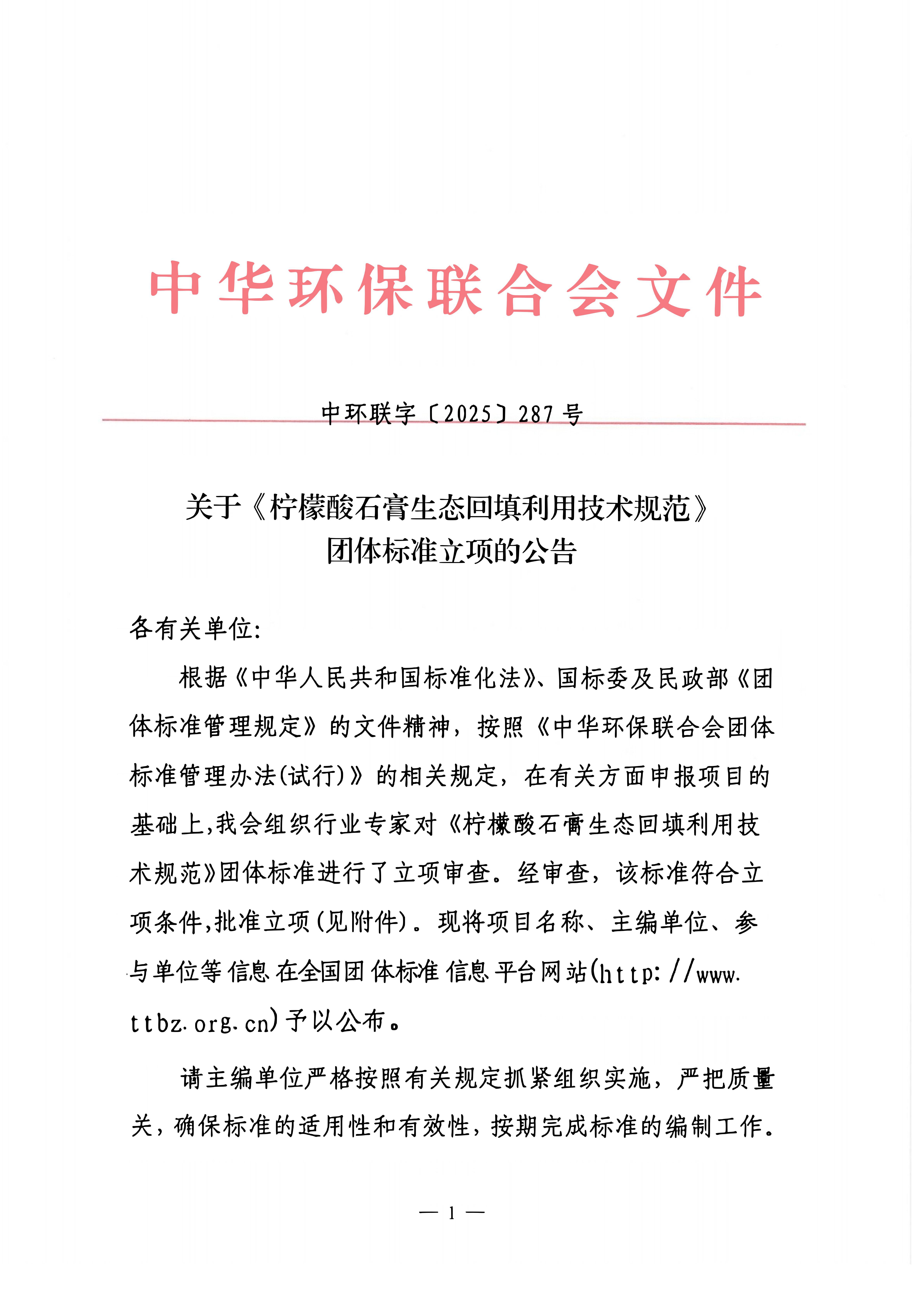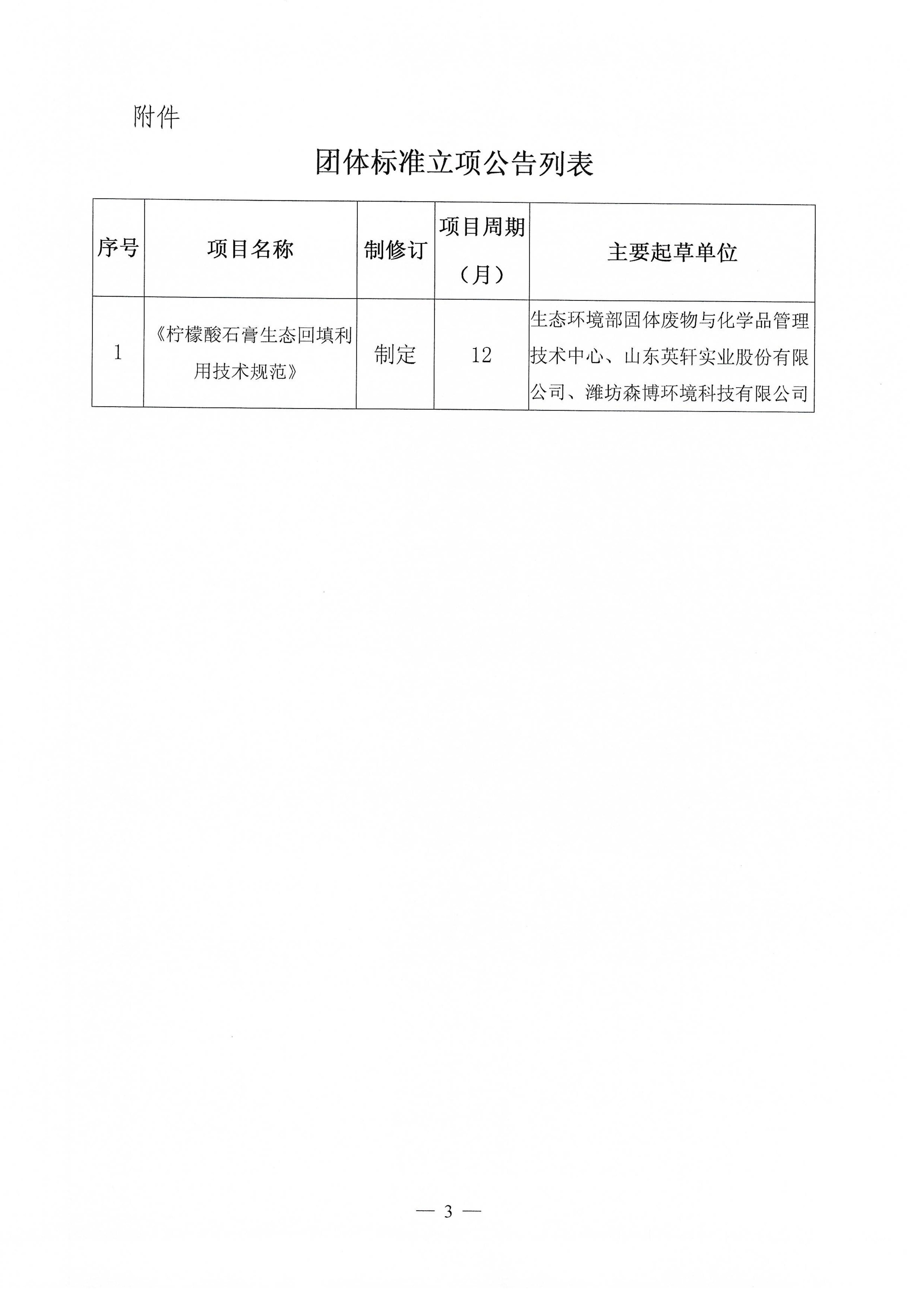关于《柠檬酸石膏生态回填利用技术规范》团体标准立项的公告