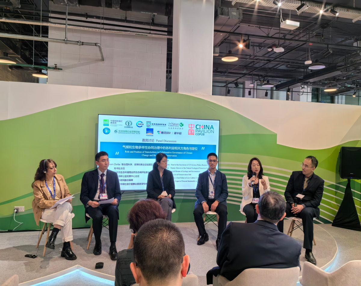 在生态环境部生态司的指导下,天博与中国绿色碳汇基金会于COP28开幕日,在大会中国角举办了“生物多样性保护与应对气候变化协同机制”主题边会。边会基于2020后全球生物多样性框架,从气候适应、生物多样性保护主流化等视角,探讨了气候公约与生物多样性公约之间的协同机制、效应和各利益相关方的工作定位。世界自然保护联盟(IUCN)、自然资源保护协会(NRDC)、大自然保护协会(TNC),野生救援(WILDAID)等国际机构协办了边会。