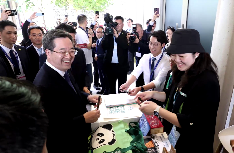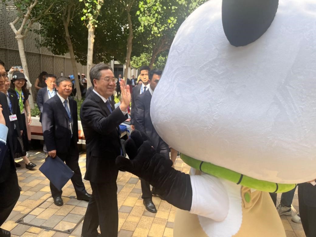 中共中央政治局常委、国务院副总理丁薛祥在“中国角”展台及活动区,了解天博团队参与设计制作的可持续纪念品、熊猫主题雕塑和玩偶。