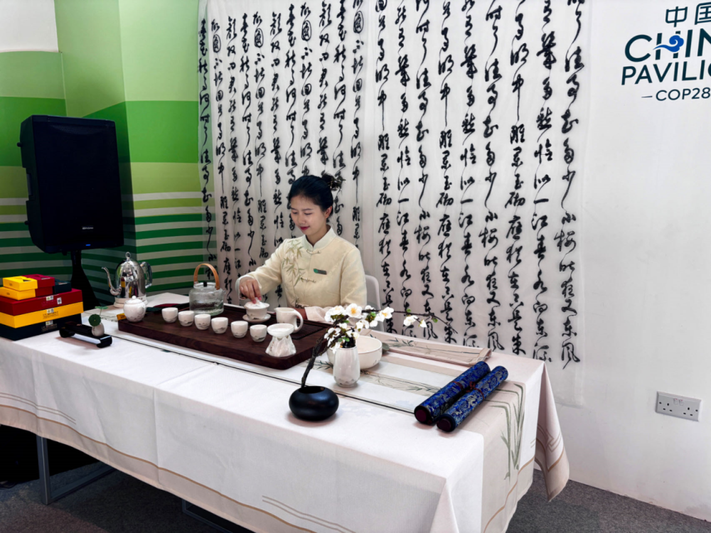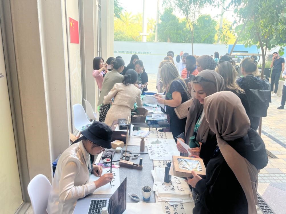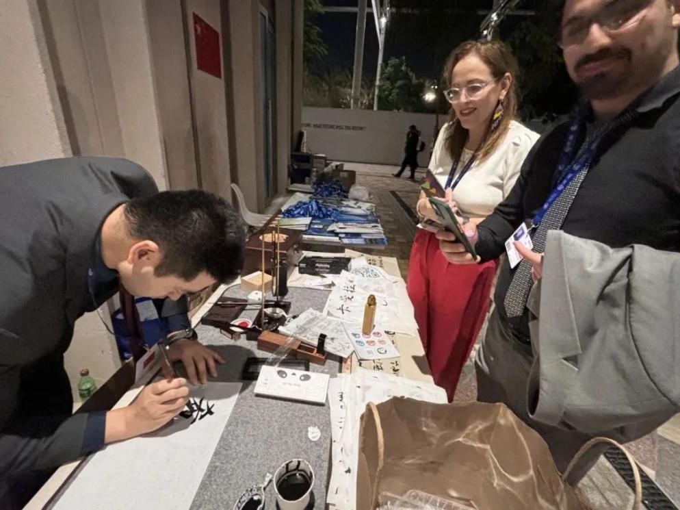 现场由天博牵头组织,交流活动区志愿者和中国角志愿者负责运营的茶艺桌和书法台受到广大国际嘉宾欢迎,参与互动的来宾络绎不绝。