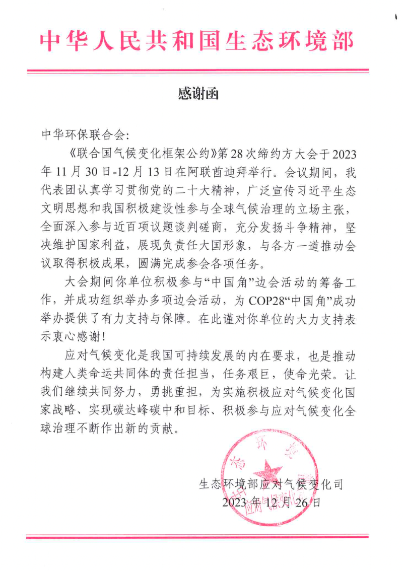 12月26日,天博收到生态环境部应对气候变化司函件,对联合会在《联合国气候变化框架公约》第28次缔约方大会期间为中国角做出的贡献表示感谢。本次气候大会期间,天博深度参与和支持了中国角相关事务,组织了多场边会活动并参与了中国角主题纪念品设计制作、场地设计和物流保障等工作,同时还于大会蓝区筹备了Solar+馆和多场联合国官方边会展览,向与会各国来宾系统展示了应对气候变化的中国民间行动。
