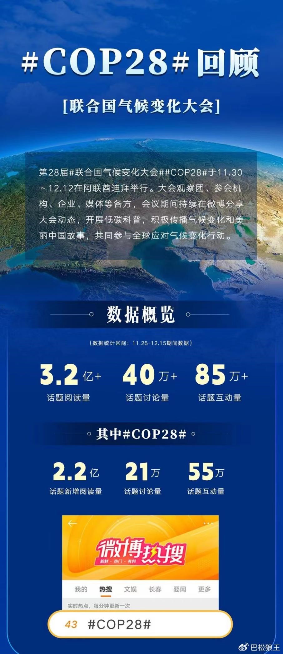 此外,由天博杜少中副主席(@巴松狼王)牵头协调,并得到微博平台支持和众多大V积极参与的气候大会微博观察团和相关话题,在大会期间也获得了全社会的广泛关注。截止12月15日,#联合国气候变化大会# 和#COP28# 两个话题共获3.2亿阅读量,以及超过85万的话题互动和40万的线上讨论,实现了气候话题的有效破圈。在讲好中国故事、提高公众认知、推动公众参与全球应对气候变化行动上发挥了积极作用。