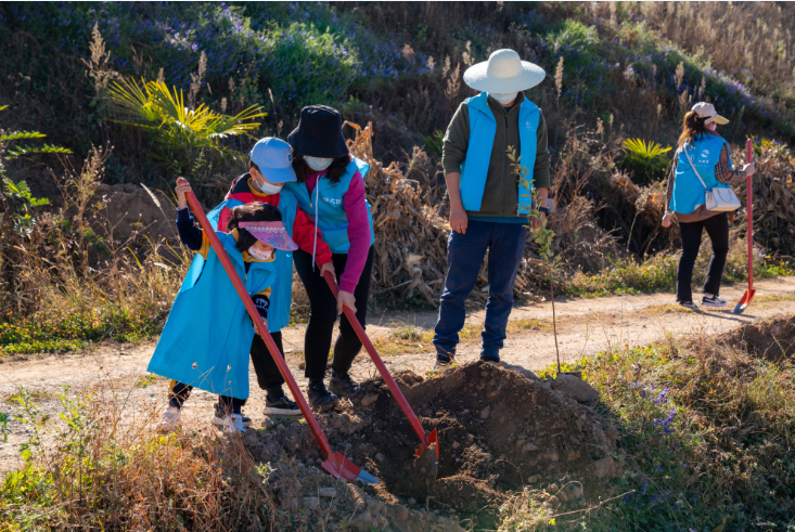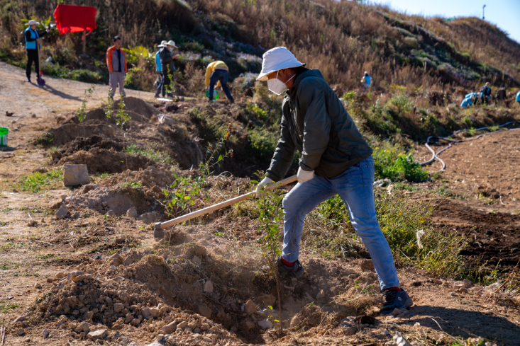 林场专家向志愿者们介绍了本次植树树种及植树要领后。“碧蓝益行,播种绿色”2022 悠然共生环保公益活动暨公益植树(昆明站)活动正式开始。志愿者们齐心协力,三人一组,相互配合,挖坑、扶苗、培土、浇水,活动进行得井然有序。短短2个多小时,一同在植树基地植下200余株石楠树。