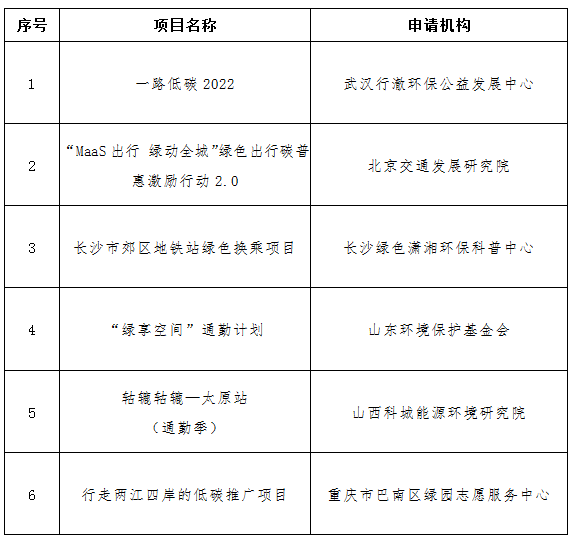 “益起低碳”策略传播小额资助计划(二期)经过项目申报征集、资料审核,共收到了来自全国的50个申报项目。在专家线上初审及现场评议后,最终确定6个项目给予资助,获得资助的项目和申请机构名单如下: