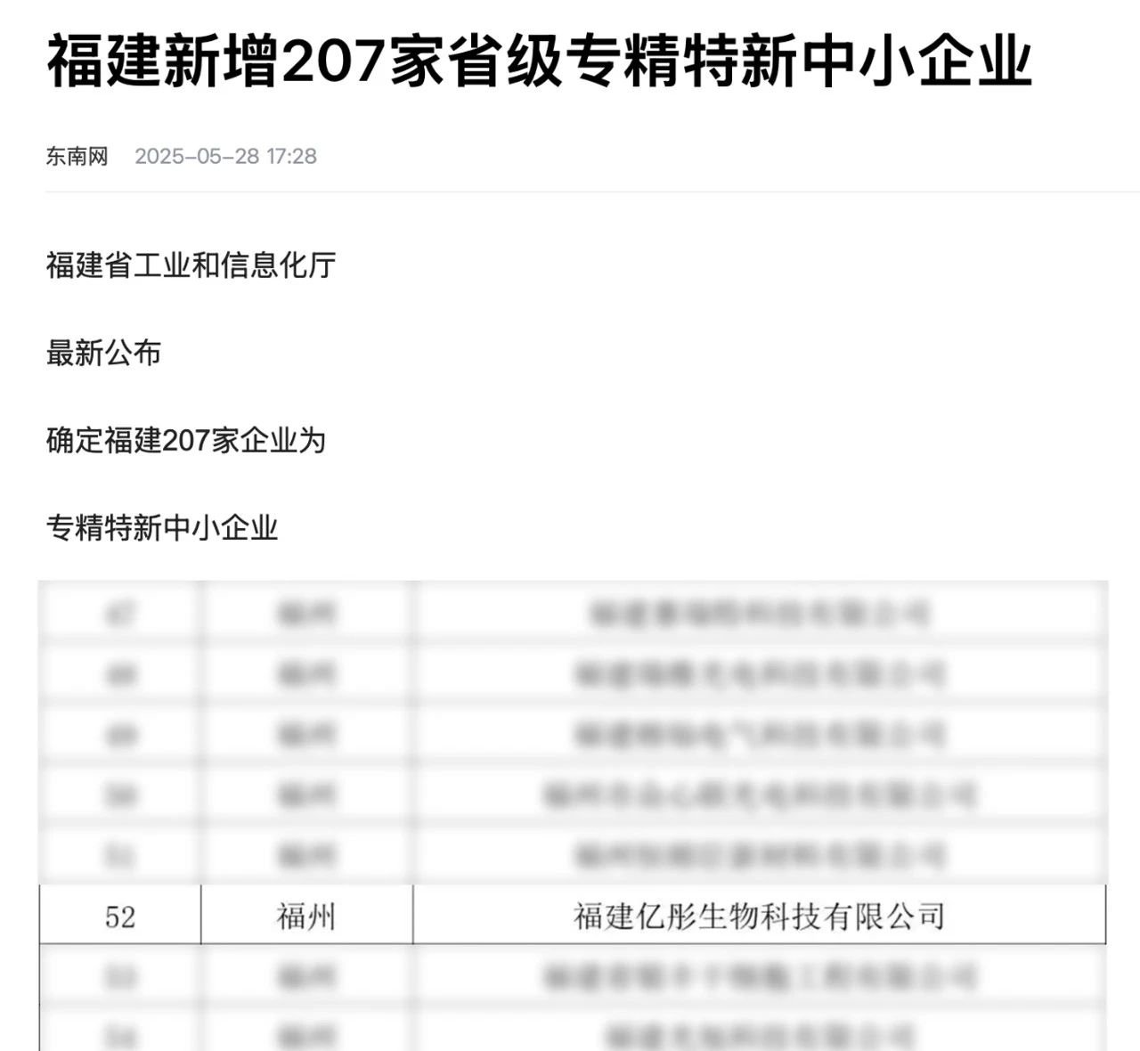 近日,福建省工业和信息化厅关于公布福建207家省专精特新中小企业名单的通知,亿彤生物科技有限公司荣耀上榜!这标志着亿彤生物在专业化、精细化、特色化、新颖化发展道路上取得了坚实的阶段性成果。
