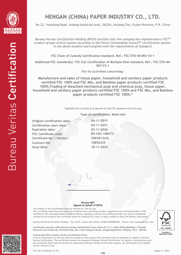 截至2025年6月30日,集团旗下山东恒安纸业有限公司、恒安(中国)纸业有限公司、福建恒安家庭生活用品有限公司以及恒安(孝感)家庭用品有限公司获得ISO 50001认证。