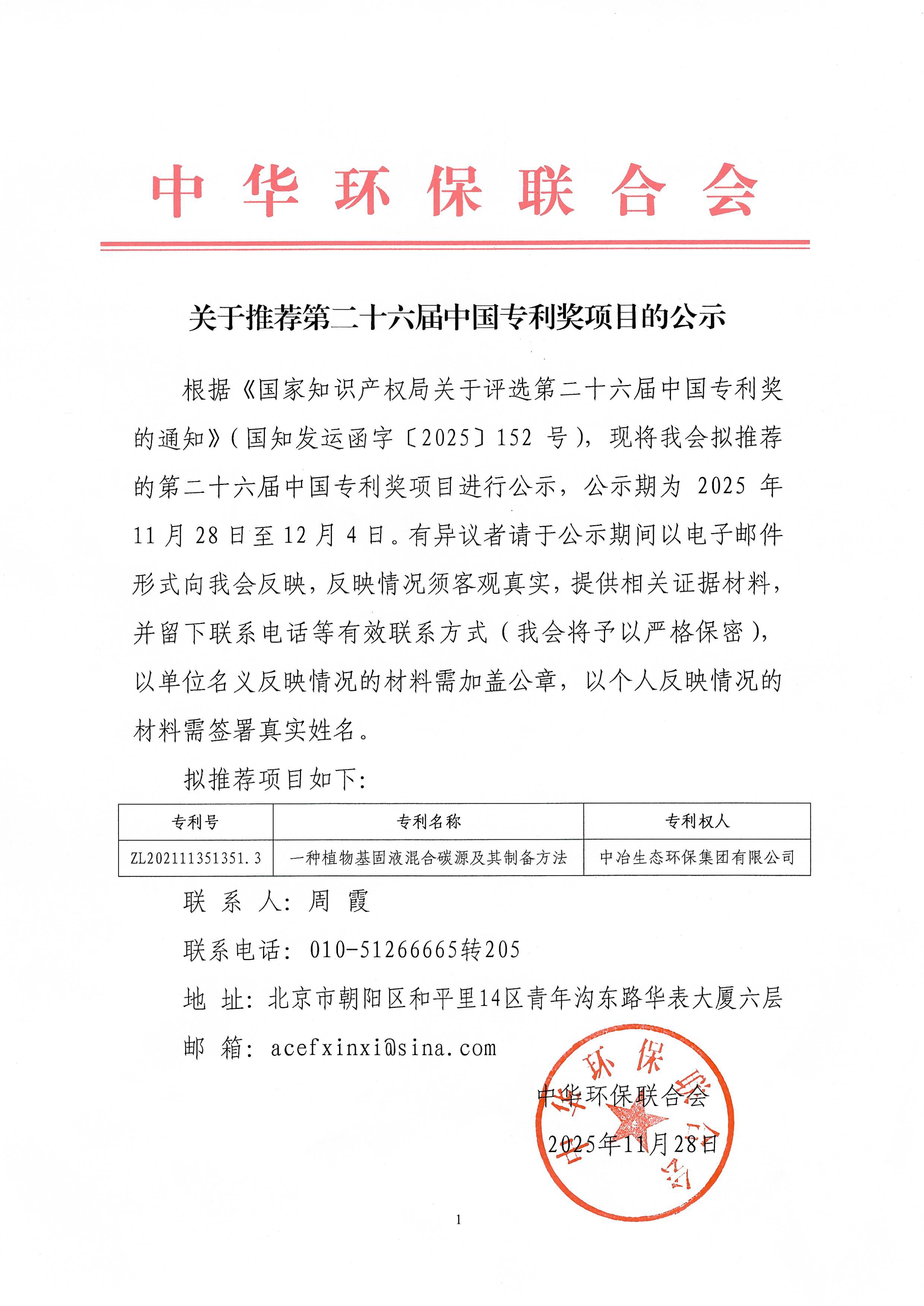 关于推荐第二十六届中国专利奖项目的公示
