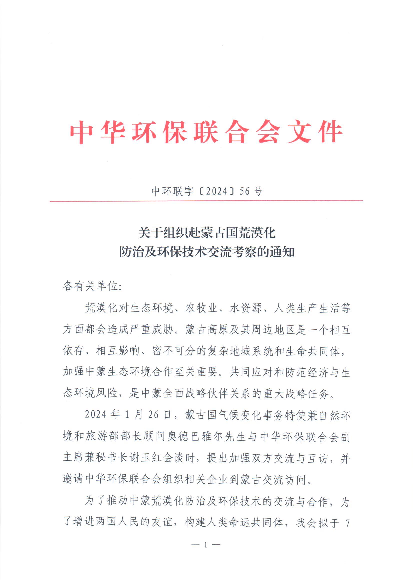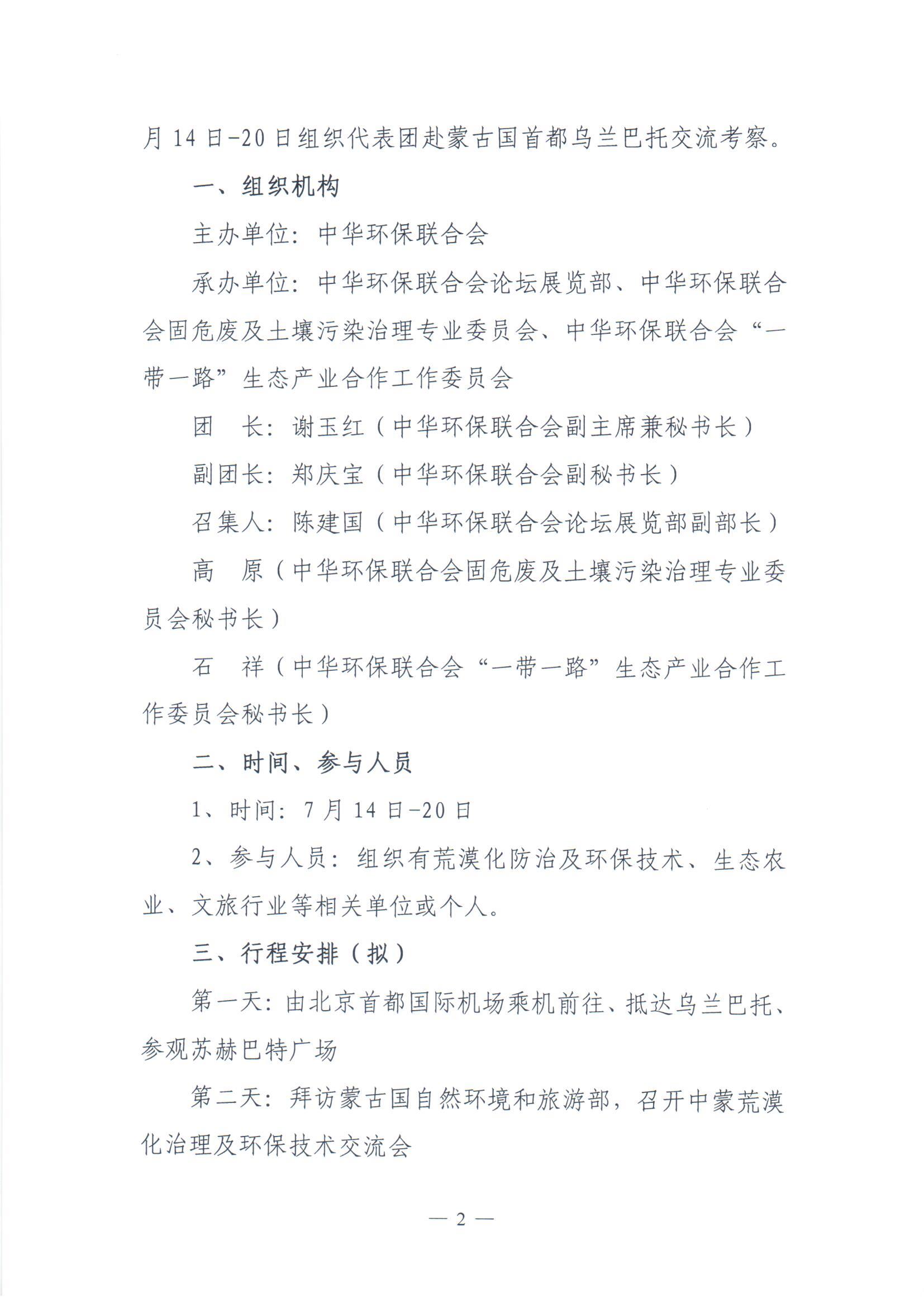 为了推动中蒙荒漠化防治及环保技术的交流与合作,为了增进两国人民的友谊,构建人类命运共同体,我会拟于7月14日-20日组织代表团赴蒙古国首都乌兰巴托交流考察。