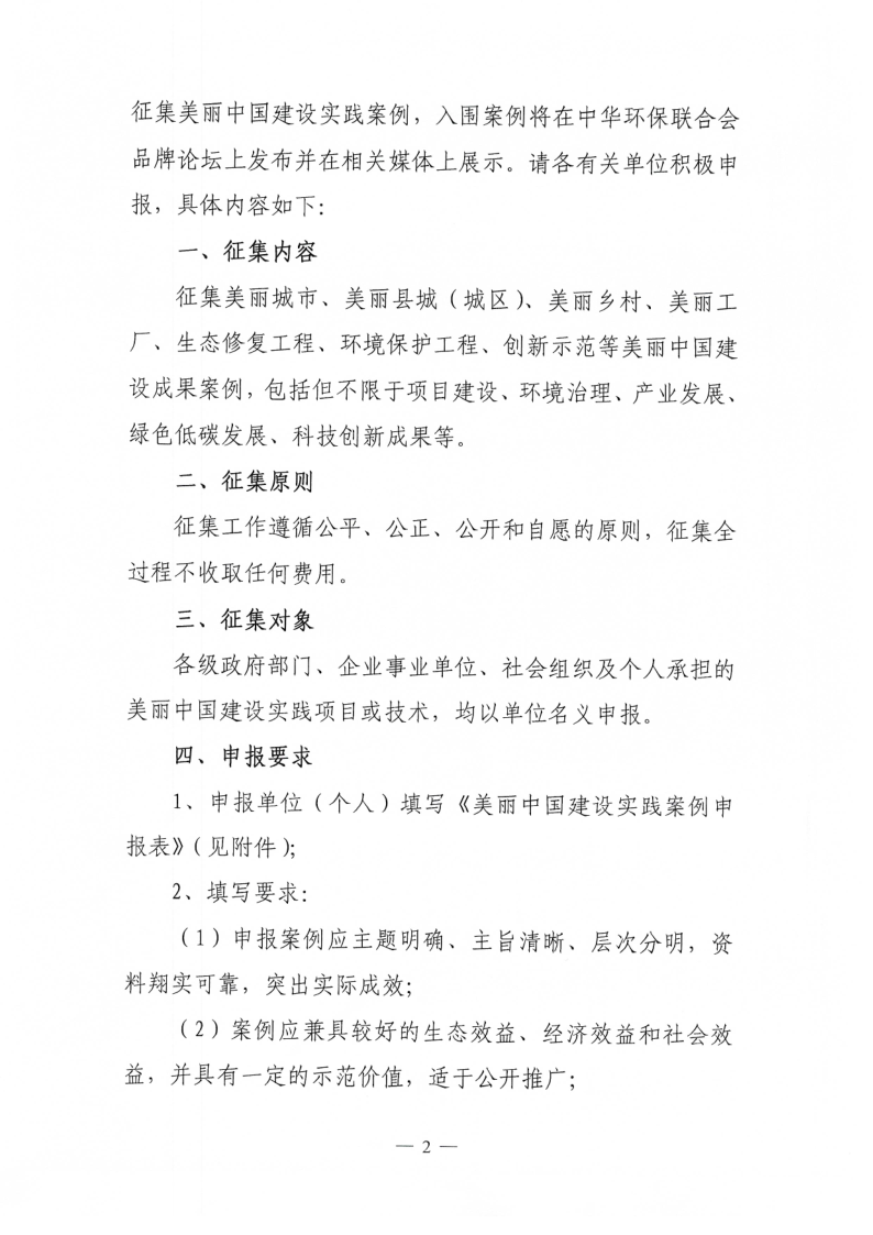 征集美丽城市、美丽县城(城区)、美丽乡村、美丽工厂、生态修复工程、环境保护工程、创新示范等美丽中国建设成果案例,包括但不限于项目建设、环境治理、产业发展、绿色低碳发展、科技创新成果等。