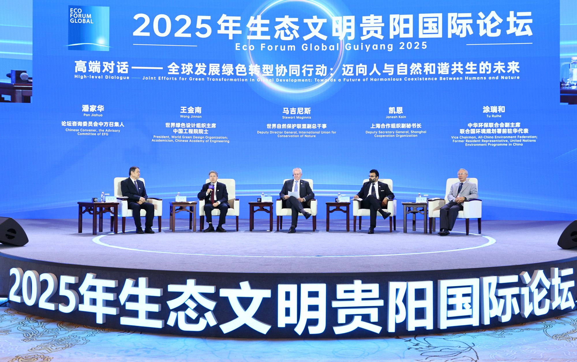 出席高端对话的其他嘉宾有世界自然保护联盟副总干事马吉尼斯、上海合作组织副秘书长凯恩,世界绿色设计组织、中国工程院院士王金南,生态文明贵阳国际论坛咨询委员会中方召集人、经济学家潘家华,高端对话由潘家华主持。