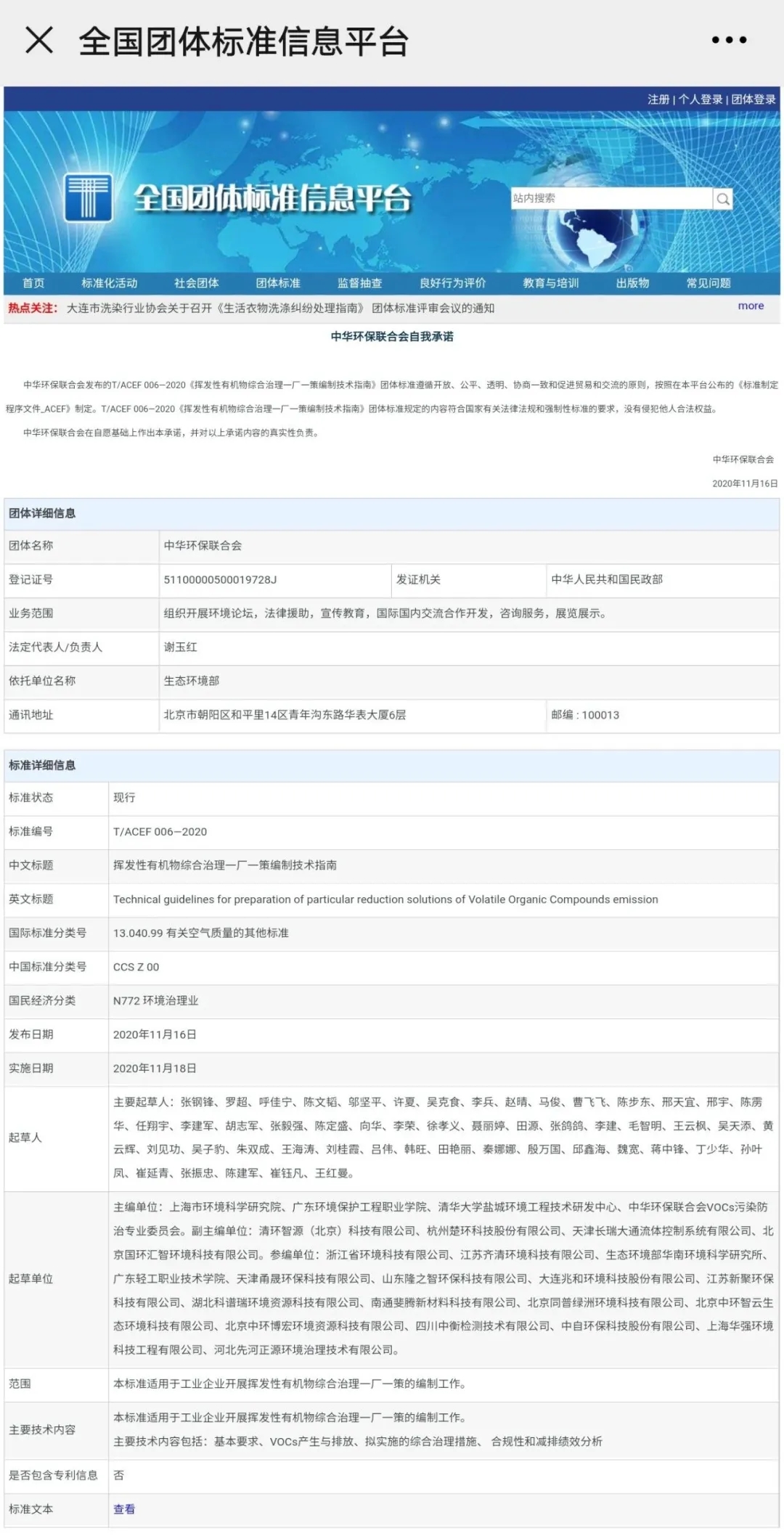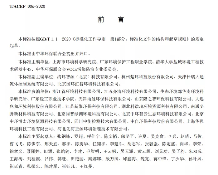 本标准主编单位:上海市环境科学研究院、广东环境保护工程职业学院、清华大学盐城环境工程技术研发中心、天博VOCs污染防治专业委员会。