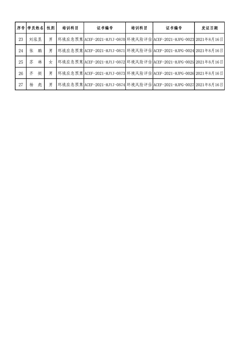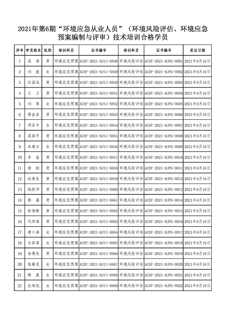 2021年第6期“环境应急从业人员”(环境风险评估、环境应急预案编制与评审)技术培训合格学员