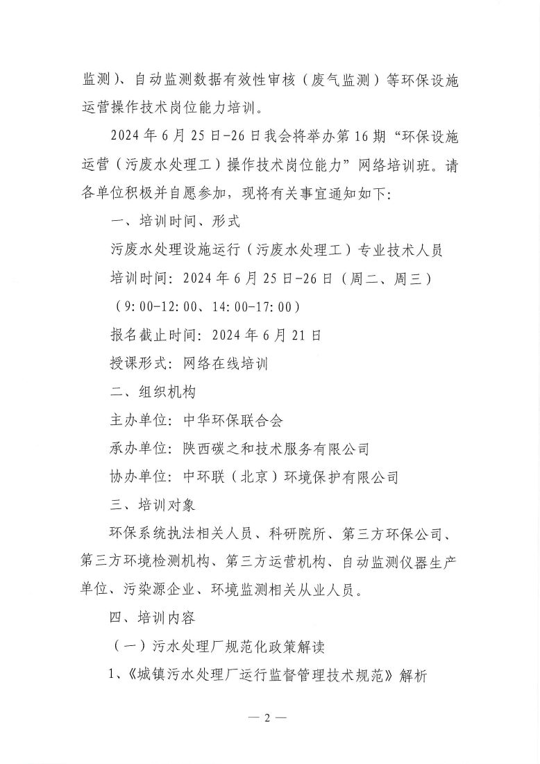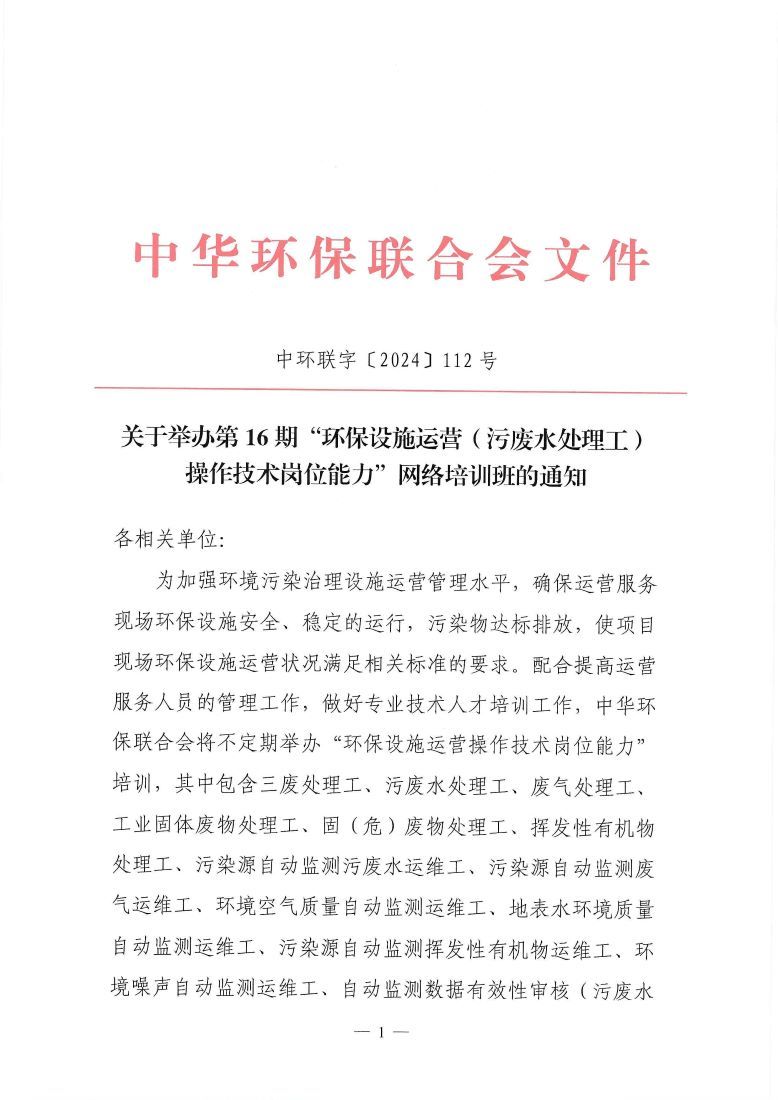 关于举办第16期“环保设施运营(污废水处理工)操作技术岗位能力”网络培训班的通知