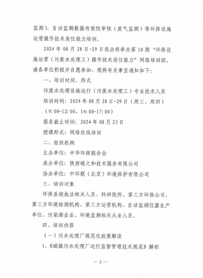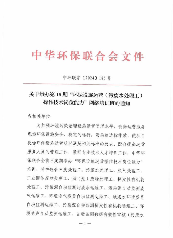 关于举办第18期“环保设施运营(污废水处理工)操作技术岗位能力”网络培训班的通知