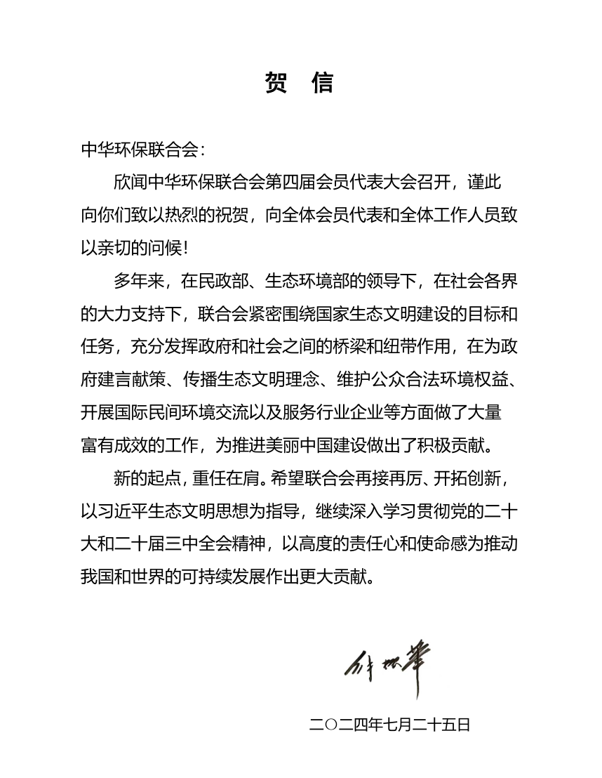 解振华在贺信中指出,多年来,在中央社会工作部、民政部、生态环境部的领导下,在社会各界的大力支持下,联合会紧密围绕国家生态文明建设的目标和任务,充分发挥政府和社会之间的桥梁和纽带作用,在为政府建言献策、传播生态文明理念、维护公众合法环境权益、开展国际民间环境交流以及服务行业企业等方面做了大量富有成效的工作,为推进美丽中国建设做出了积极贡献。新的起点,重任在肩。希望联合会再接再厉、开拓创新,以习近平生态文明思想为指导,继续深入学习贯彻党的二十大和二十届三中全会精神,以高度的责任心和使命感为推动我国和世界的可持续发展作出更大贡献。