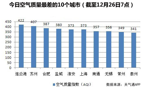 人民网北京12月26日电 (蒋琪)截至今天早上7时,连云港的AQI(空气质量指数)达到422,属于六级严重污染,成为74个公布PM2.5数据城市中空气质量最差的城市。今日空气质量最差的10个城市分别是连云港、苏州、合肥、盐城、淮安、上海、南通、无锡、常州、泰州,其中连云港、苏州、盐城、淮安、南通、无锡、常州、泰州等8个属于江苏省。据统计,今日江苏省12城市重度及以上污染。上海AQI指数超过300,属于六级严重污染。