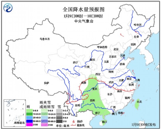 9日08时至10日08时,山东半岛东部、陕西西南部、贵州西北部等地有小雪或雨夹雪;西南地区东部、广西、广东西南部、海南岛东部及台湾等地有小雨或阵雨。东海、台湾海峡、南海东北部和中东部有7~8级、阵风9~10级的偏北风或东北风。