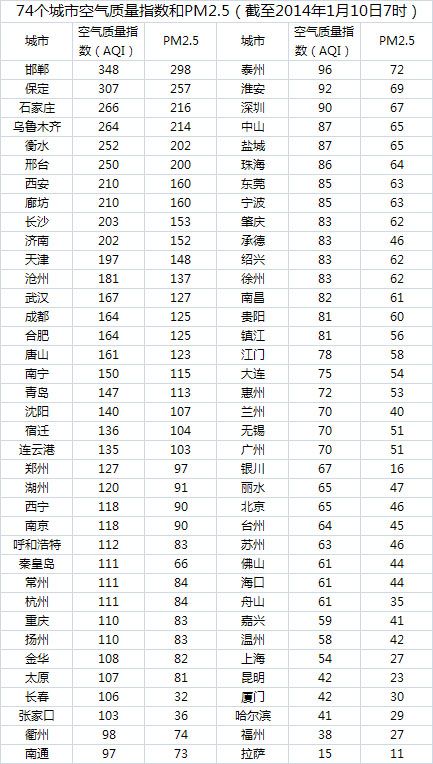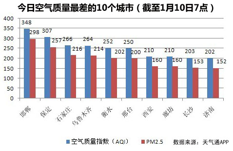 人民网北京1月10日电 (蒋琪)截至今天早上7时,邯郸的AQI(空气质量指数)达到348,属于六级严重污染,成为74个公布PM2.5数据城市中空气质量最差的城市。今日空气质量最差的10个城市分别是邯郸、保定、石家庄、乌鲁木齐、衡水、邢台、西安、廊坊、长沙、济南,其中邯郸、保定、石家庄、衡水、邢台、廊坊等6个属于河北省。据统计,今日长沙的AQI达到203,属于重度污染,长沙已连续四日重度及以上污染。