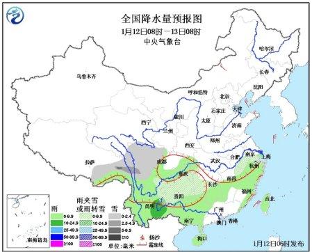 中新网1月12日电 中央气象台发布最新天气预报,预计,12~13日,南方地区有较大范围雨雪天气。青藏高原中东部、贵州、云南东北部、江南西北部和东北部等地的部分地区有小到中雪或雨夹雪。西藏南部、江南、华南、云南大部等地有小雨或阵雨。