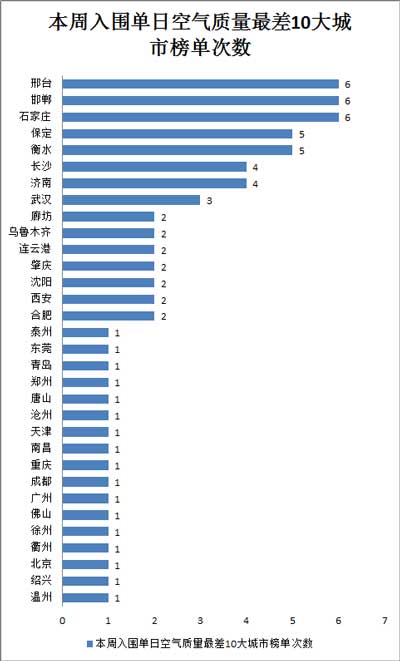 上周河北多城频繁现身空气质量单日最差十大城市排行榜,邯郸、邢台、石家庄6次上榜单日空气质量最差10大城市。