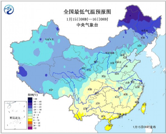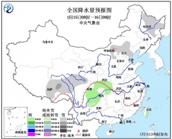15日08时至16日08时,内蒙古中部、华北东北部、黑龙江中东部、青海南部、西藏地区东部、川西高原北部和贵州西北部等地有小雪或雨夹雪,其中青藏高原东部局地有中雪;四川盆地中西部、重庆、贵州西北部、湖北西部和台湾等地有小雨或阵雨。东海南部、南海东北部、南海中部和西南部将有7~8级、阵风9~10级的东北风。