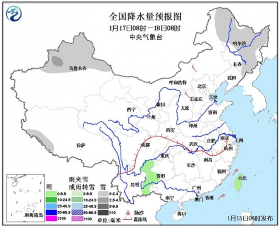 17日08时至18日08时,新疆北部、内蒙古东北部、吉林东部、黑龙江大部、西藏西南部等地有小到中雪或雨夹雪;云南东部、贵州西部、台湾等地有小雨或阵雨。南海中部和西南部海域的东北风将逐渐增强为7~8级、阵风9级。