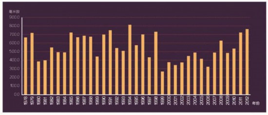 另外,根据北京市气象局1978年至2012年的气象统计资料,北京32年间的年平均降水量为549.1毫米。2012年,北京降水量760.4毫米,较常年偏多39.3%,也为近35年最多。