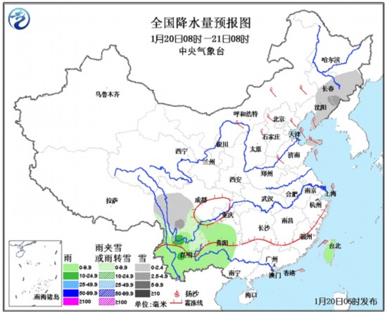 中央气象台未来24小时最新预报为:预计,西藏东部、川西高原、云南北部、贵州西北部、吉林中东部、辽宁东部、山东半岛北部等地有小到中雪或雨夹雪天气;云南中南部、贵州大部、广西西北部及台湾等地有小到中雨天气。另外,淮河以北大部地区有4~6级偏北风。黄海、东海南部、南海西南部有7~8级风。