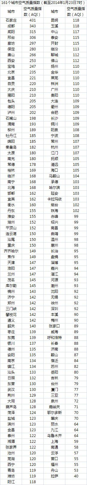 说明:自2014年1月1日起,环保部发布空气质量实时信息、空气质量月报及参与空气质量排名的地级城市已由74个增加到161个,包含了直辖市、省会城市、计划单列市、“三区”所有地级城市、环保重点城市和环保模范城市。人民网环保频道将采用环保部的官方数据,对161个城市每日空气质量进行排行。