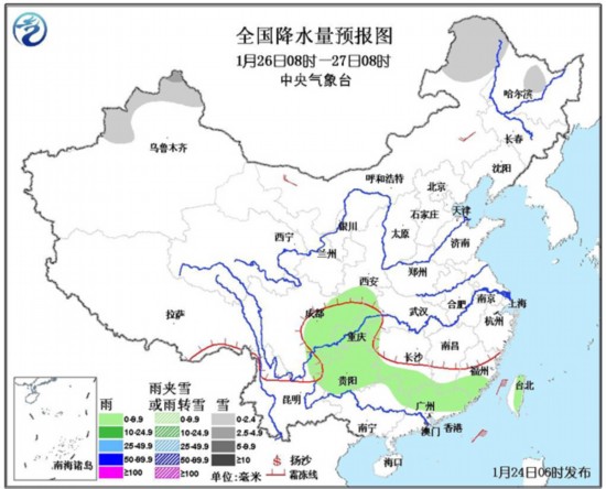 26日08时至27日08时,新疆西北部、内蒙古东北部、黑龙江西北部等地有小到中雪;西南地区东部、江南西南部、华南北部等地有小雨或阵雨。东海南部、南海中东部有6~7级、阵风8级的东北风。