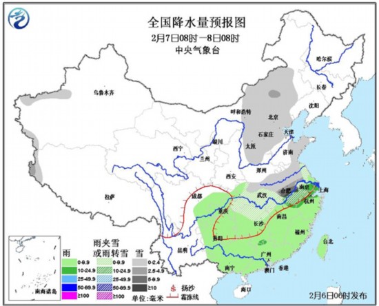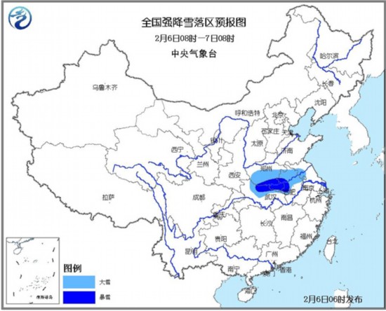 中国气象网讯 据中央气象台预报 2月6日至8日,中东部地区有大范围雨雪天气。6日至7日,河南中南部、湖北北部、安徽中北部、江苏西部等地有大雪,部分地区暴雪。中央气象台2月6日06时继续发布暴雪黄色预警。