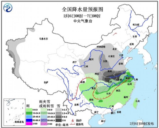 6日08时至7日08时,新疆西南部、西藏西部、内蒙古中西部偏南地区、西北地区东部、华北大部、黄淮、江汉、江淮、江南西北部等地有小到中雪或雨夹雪,其中,河南中南部、安徽北部、江苏中部偏西地区、湖北北部等地有大雪,部分地区有暴雪(10~16毫米)。西南地区中东部、江南、华南北部等地有小到中雨。