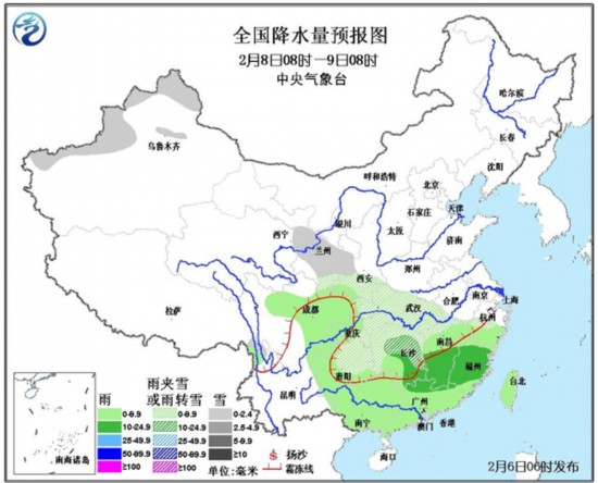 8日08时至9日08时,新疆北部、西北地区东南部、西南地区东部、江汉、江南北部等地有小雪或雨夹雪;西南地区东部、江南、华南和台湾等地有小雨到中雨。内蒙古中西部有4~5级风。渤海、渤海海峡、黄海北部海域将有6~8级、阵风9级的东北风。
