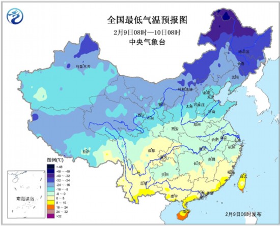9日08时至10日08时,新疆西北部、陕西南部、青藏高原东部、江汉、江南大部、贵州中北部等地有小到中雪或雨夹雪,其中,湖南中部、江西中部、浙江中部偏南地区等地的部分地区有大雪,其中,江西东北部、浙江西部的局部地区有暴雪(10~12毫米);另外,贵州中部、湖南西北部、江西南部等地的部分地区有冻雨。四川盆地、华南、福建等地有小到中雨,其中,福建中部等地的部分地区有大雨。东海南部、台湾海峡、北部湾、南海北部有7~9级的风,黄海、东海北部有6~8级的风。