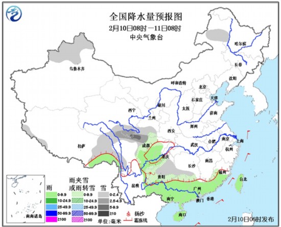 中国气象网讯 10日~12日,南方地区多雨雪天气,气温偏低。10日~11日,西北地区东南部、四川北部、贵州、江南西部等地有小到中雪或雨夹雪,青海东南部的部分地区有大雪;12日开始,青藏高原东部及其以东地区将自西向东又有一次雨雪天气过程。