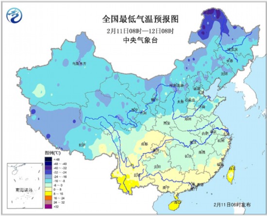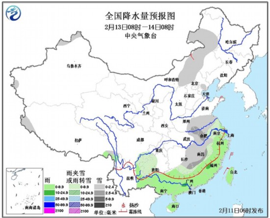 11日08时至12日08时,新疆北部、青藏高原中东部、西北地区东部、贵州、湖北西部、湖南南部和西部等地有小雪或雨夹雪,其中,青海东部、甘肃中部等地的部分地区有中到大雪;贵州中部的部分地区有冻雨;四川盆地、华南大部等地有小雨。东海大部、台湾海峡、南海中北部有7~8级、阵风9级左右的偏北到东北风。