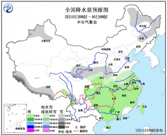 15日08时至16日08时,新疆北部、西藏西南部、内蒙古东部、甘肃南部、青海东部等地有小到中雪或雨夹雪,其中,西藏西南部的部分地区有大到暴雪;江南、华南、西南地区东部等地的部分地区有小到中雨。