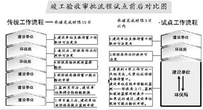 传统的工作流程是由建设单位将所需材料递交至环保局接待窗口,环保局受理后组织现场踏勘,建设项目环保设施符合相应要求的,由环保局作出行政许可决定,最后,建设单位至接待窗口领取许可决定书。